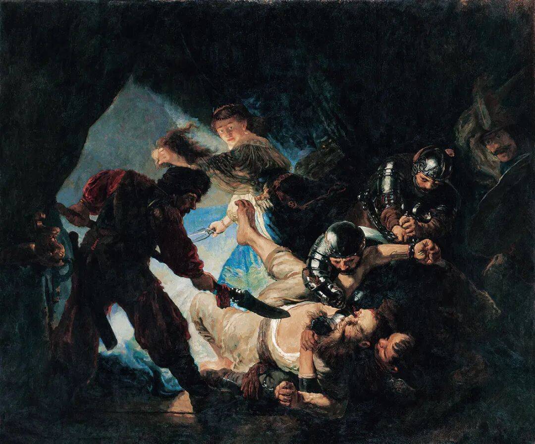与伦勃朗原作相比,徐悲鸿的临作在笔触、光影等细节上极为接近,色彩关系也高度一致,保留了伦勃朗典型的粗犷风格。画面中丰富的细节层次——众人微妙的表情、夸张的肢体动作,乃至盔甲上的金属反光——都被细腻呈现,烘托出紧张的氛围。在博物馆光线不足的条件下,徐悲鸿仍能再现伦勃朗画作中复杂的画面效果,可见其卓越的造型能力以及对欧洲古典绘画色彩与构图的深刻理解。