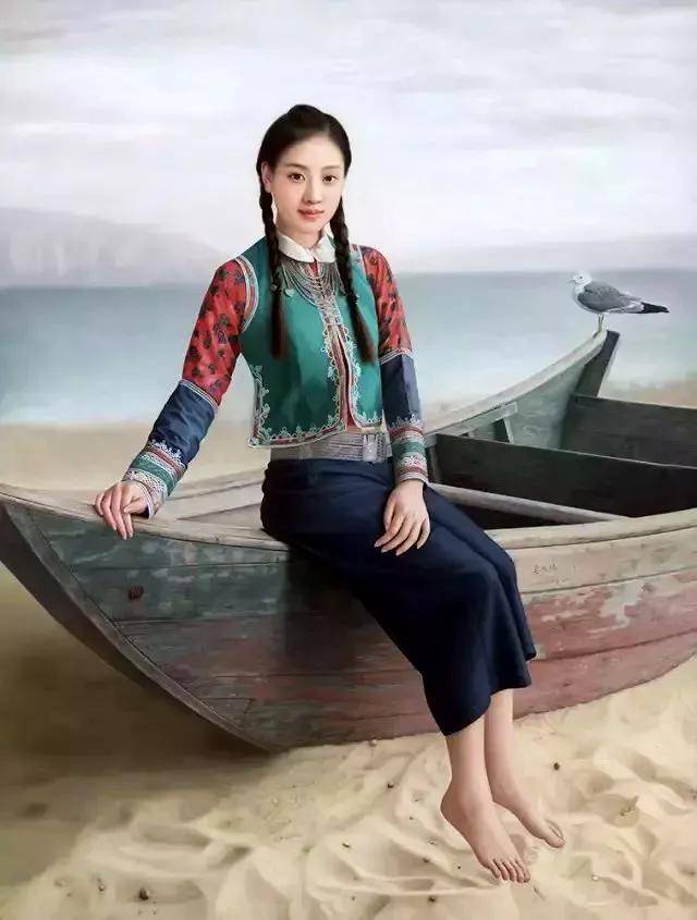 画面中的惠安女子,身着绣花襟衫和阔大的黑裤,色彩鲜明,具有很强的视觉冲击力。吴成伟巧妙地在这身民族服饰中赋予了一份岁月的沧桑,使人物形象更加立体和深刻。女孩静静坐在船头,仿佛在等待着什么,一缕微光照耀过来,圣洁之感油然而生。这种圣洁,正是画家要极力表现的东西。