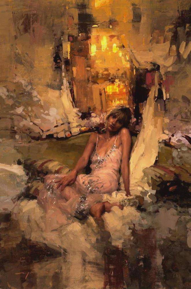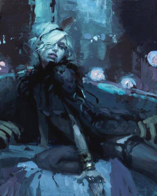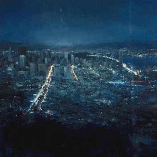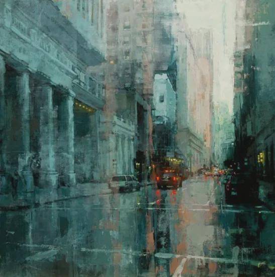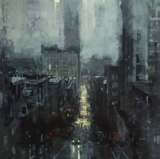 曼恩的创作灵感主要来源于他所居住的城市——旧金山。他以一种极其细腻和动态的手法描绘周围的人和城市风光,特别是雨中的城市路面,那里的路灯和霓虹灯在雨水的反射下闪烁着迷人的光芒。他的画作不仅仅是视觉上的享受,更是情感和戏剧性的表达。在每一幅作品中,曼恩都在努力营造一个充满个性和情感的城市场景,让观众能够感受到城市生活的脉动和节奏。