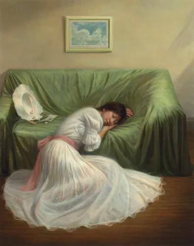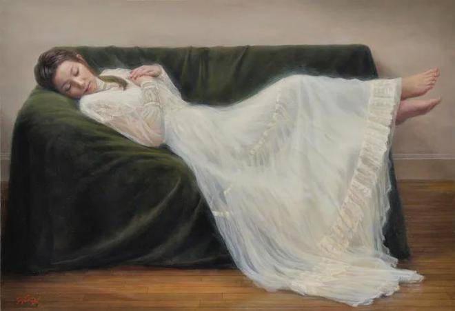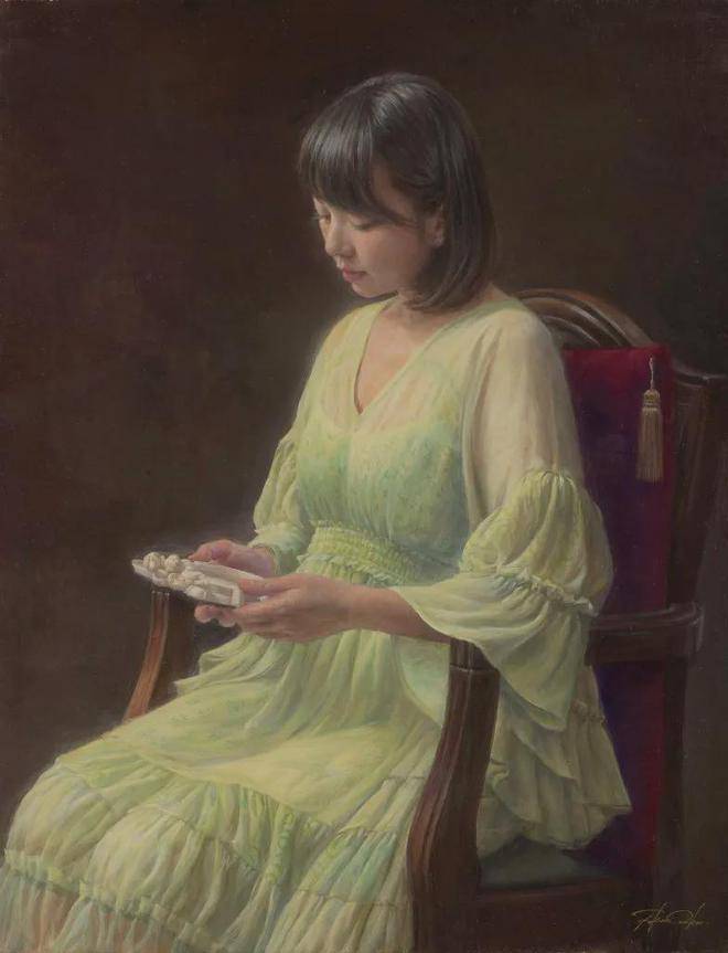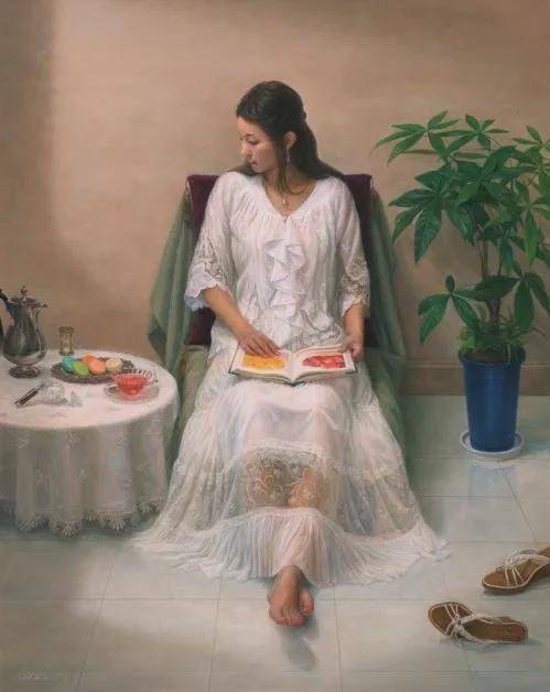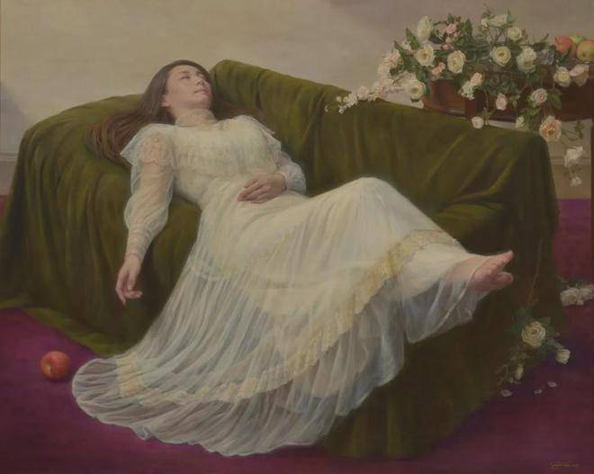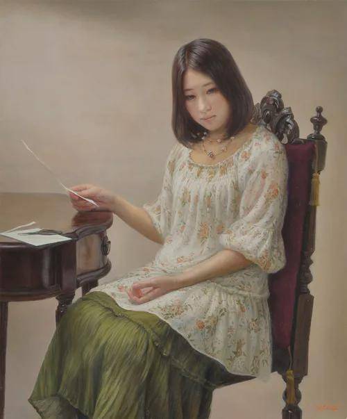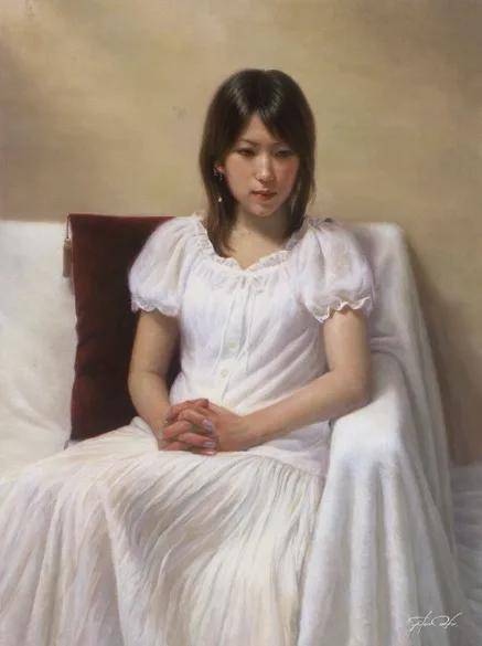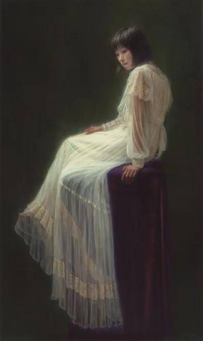 福井欧夏的艺术创作深受现场写生主义的影响,他坚持在现场与模特面对面地创作,这种方法要求艺术家在模特面前直接作画,捕捉模特的每一个细节和瞬间。他的画作不仅仅是对模特外观的复制,更是对模特存在的一种深刻理解和表达。他的作品通过对模特的仔细观察和细致描绘,将模特的呼吸、肤色、甚至是织物的摩擦声等细节都转化为画布上的色彩和纹理。