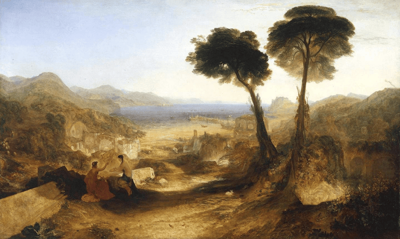 那么,谁在这一展览中胜出了?在传统观念中,透纳的画中“诗意”胜过了康斯太勃尔描绘的“散文”。透纳是个十足的旅行家,总是四处寻觅壮丽的远方。他也是个古怪的艺术家,在工作室里装了个窥视孔,以便偷窥访客。在创作上,他对铬黄有着异乎寻常的喜爱。展览中,作品《古意大利:奥维德被逐出罗马》上一次在伦敦展出还要追溯到二十世纪七十年代。这件作品既充满魔幻色彩又略显怪诞,仿佛是对另一个星球上生物的未来主义描绘。