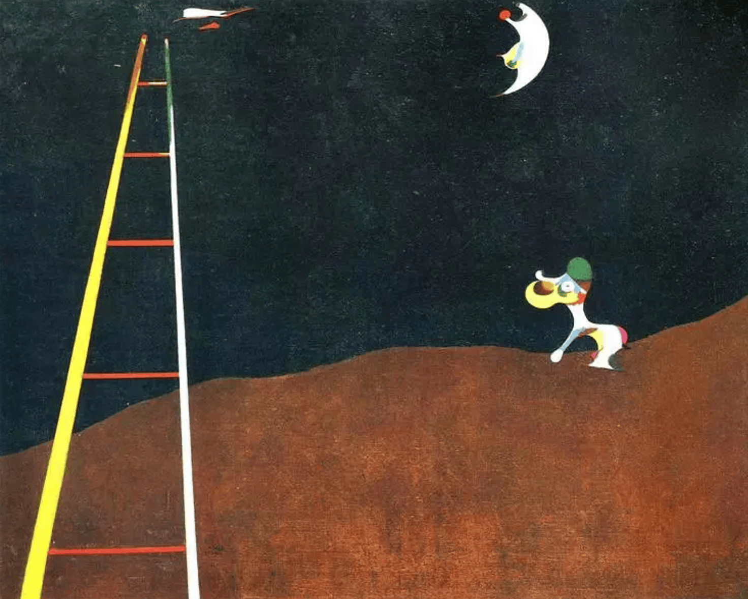 他的精神状态在他的画作《丑角狂欢节》中显露无疑。他试图描绘自己内心的混乱,那种想要摆脱混乱的绝望,以及由此产生的痛苦。米罗在这幅画中描绘了梯子的象征意义,这个象征意义在他之后的许多画作中也出现过。它象征着逃离。