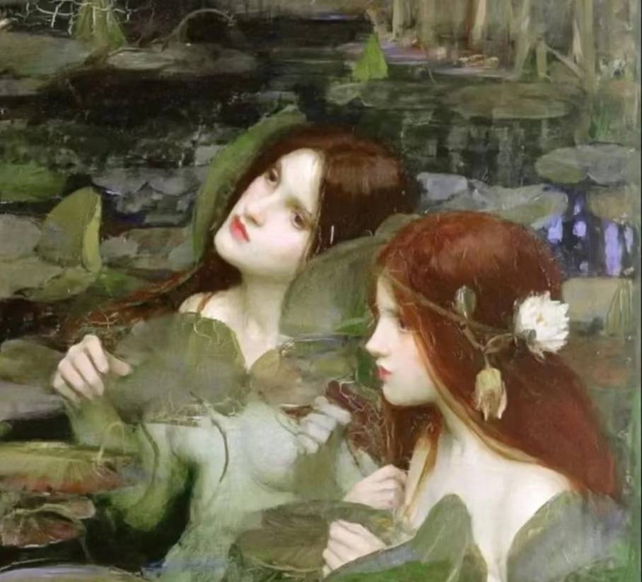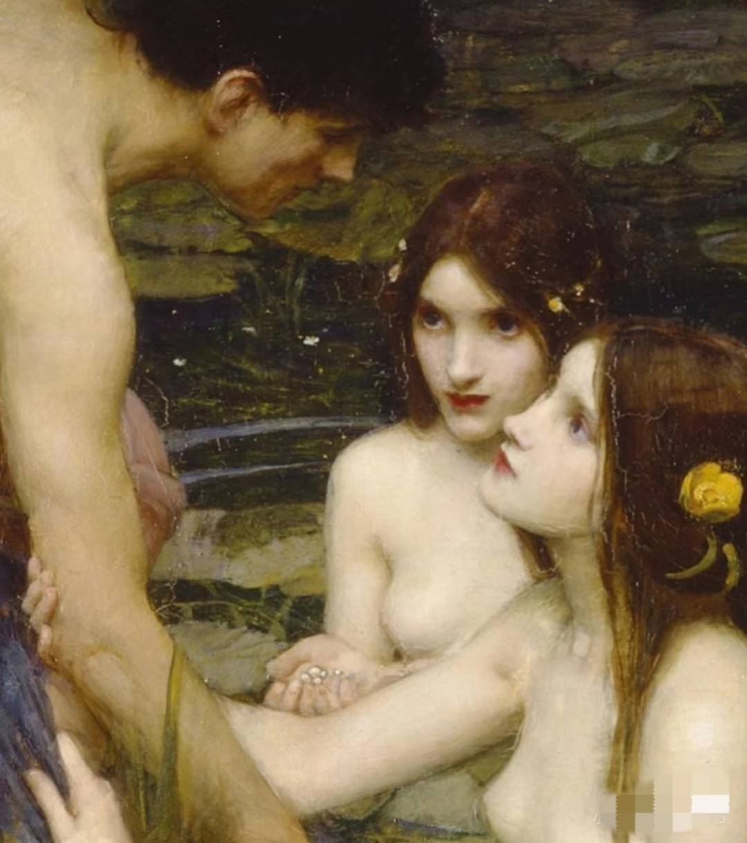 这种写实与诗意的交融,正是拉斐尔前派对沃特豪斯的深刻影响。仙女们的手臂如藤蔓缠绕,她们的凝视既含诱惑又带哀矜,构成一个无法挣脱的温柔陷阱。