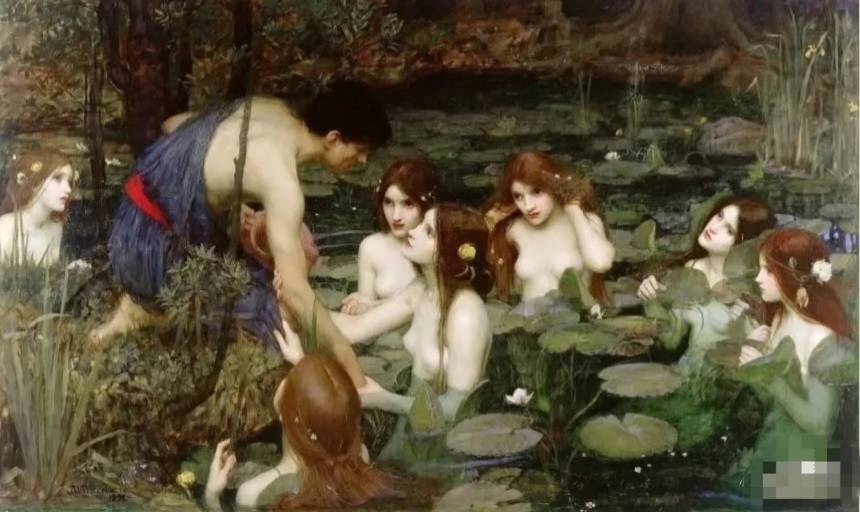 创作于1896年的《许拉斯和水中仙女》,以其97厘米×160厘米的尺幅,在曼彻斯特市美术馆的墙上低语着一个关于美与沉溺的永恒寓言。画面凝固在许拉斯俯身取水的瞬间。七位水中仙女从睡莲环绕的潭水中浮现,她们苍白的肌肤在幽暗的水面泛着冷光。