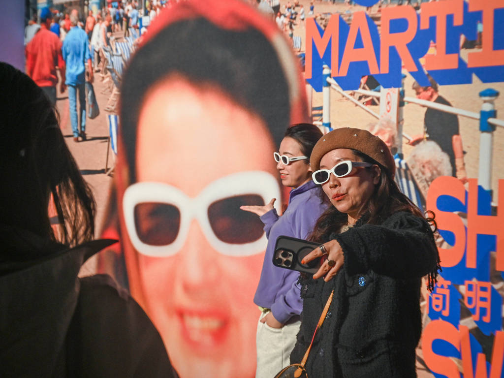 2025年3月13日,英国摄影师马丁·帕尔的个展“简明扼要”开幕,展览主海报上的一款白色墨镜周边成了观众们打卡的“好道具”。澎湃新闻记者 吴栋 图
