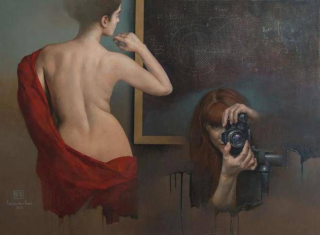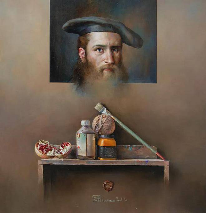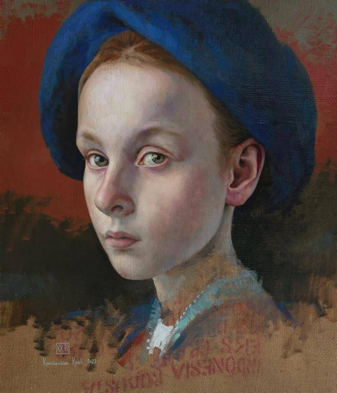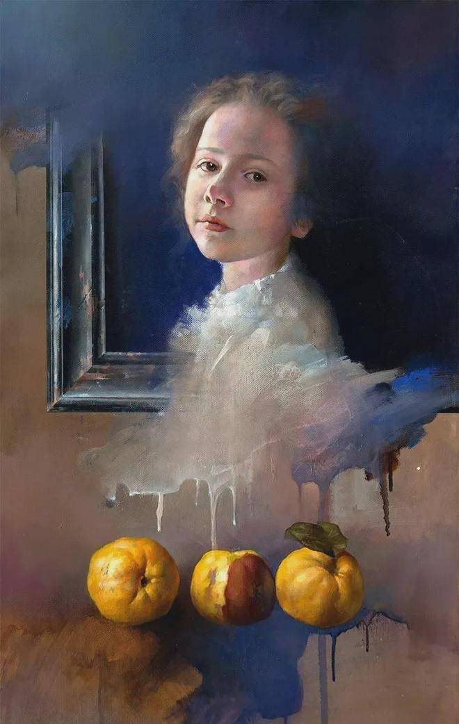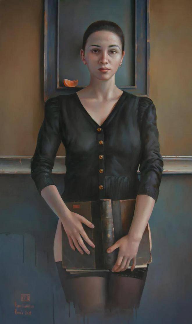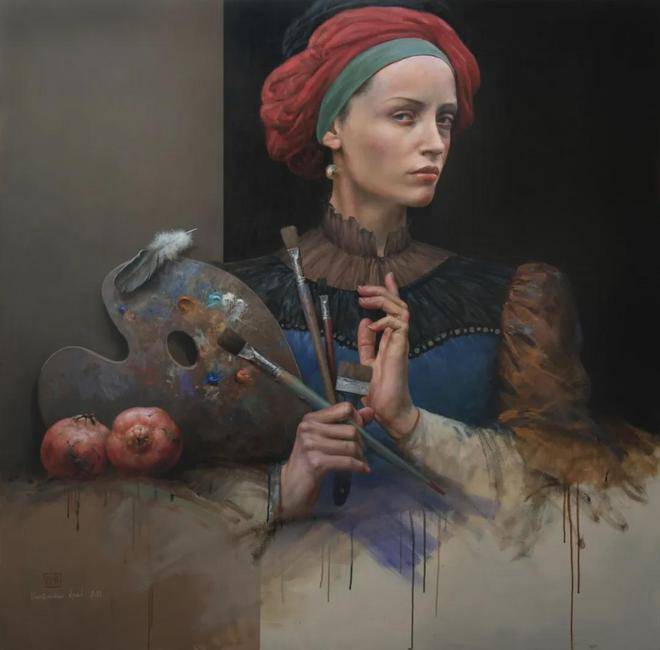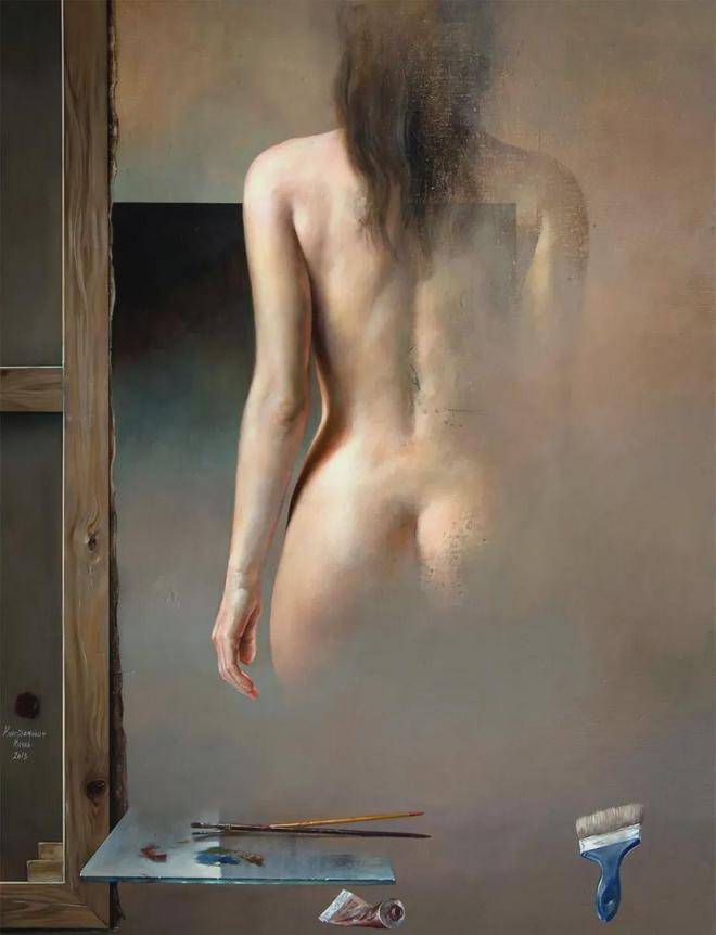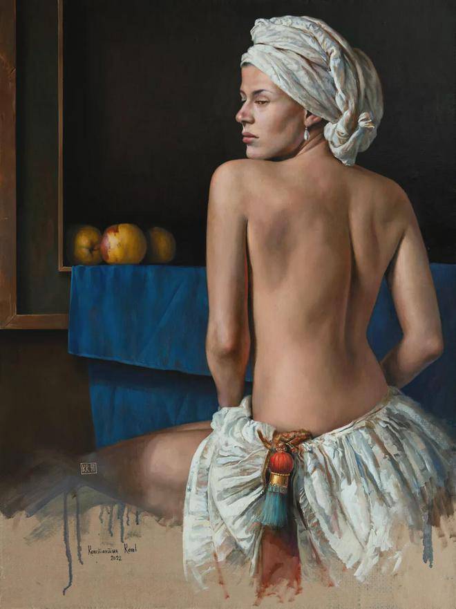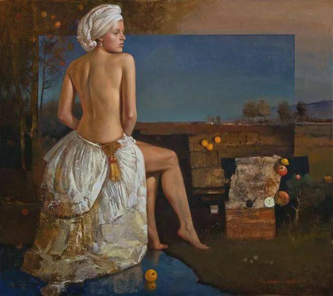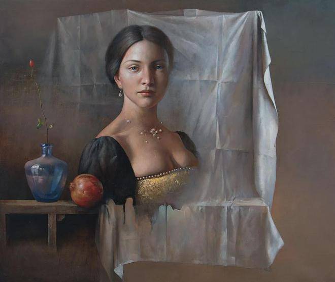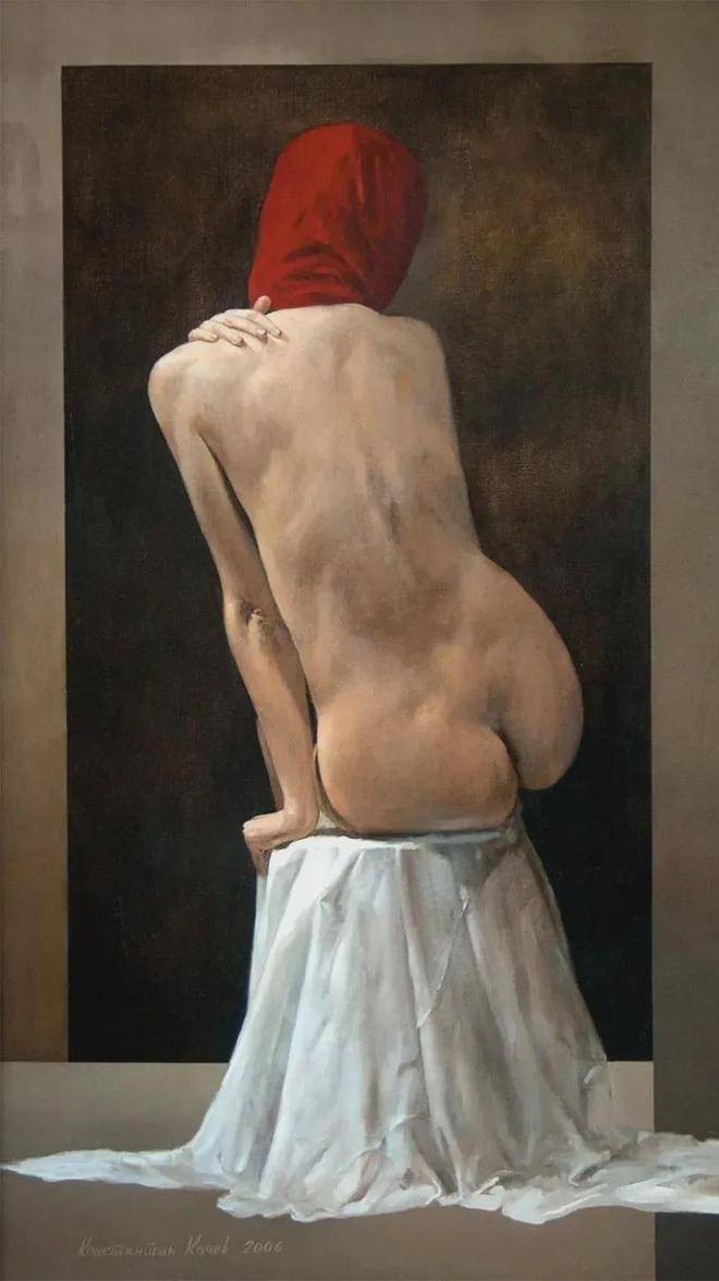 卡切夫的技法堪称一场精密计算的美学实验。他采用超写实主义(Hyperrealism)的细腻笔触,却赋予画面以象征主义的色彩逻辑: