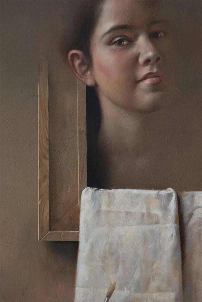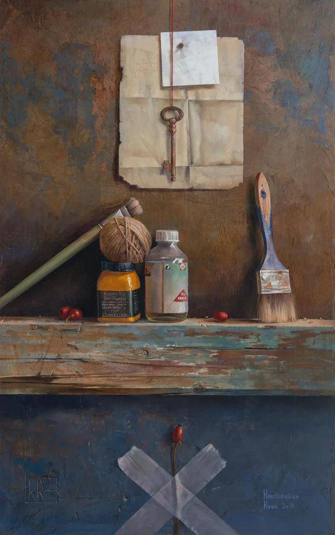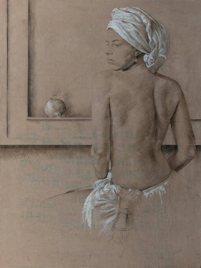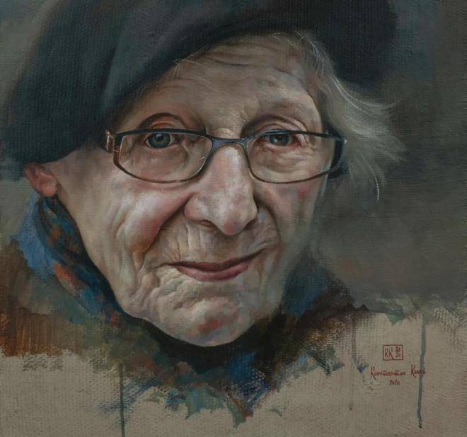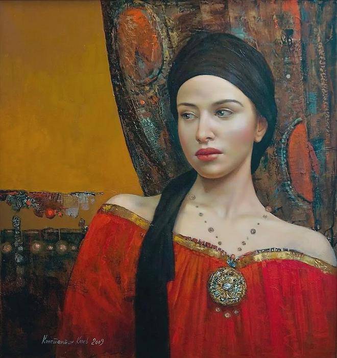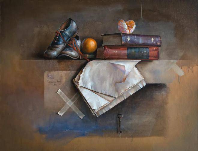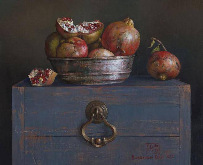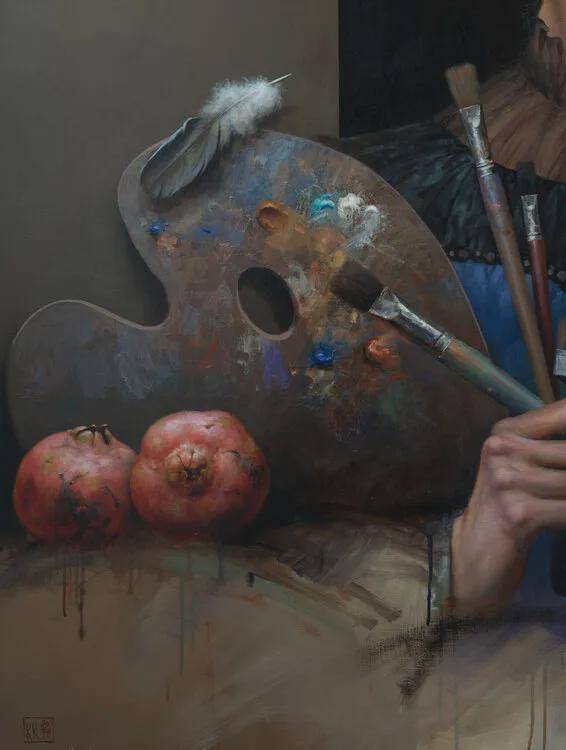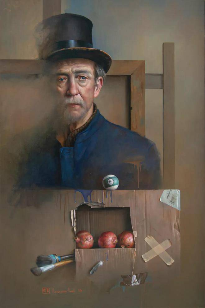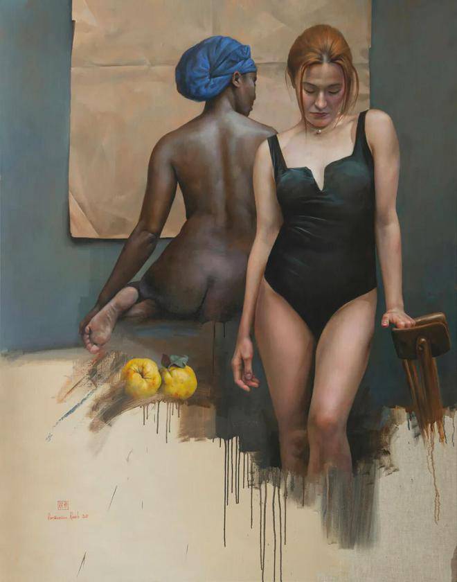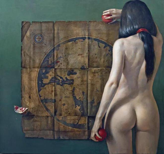 卡切夫的技法堪称一场精密计算的美学实验。他采用超写实主义(Hyperrealism)的细腻笔触,却赋予画面以象征主义的色彩逻辑: