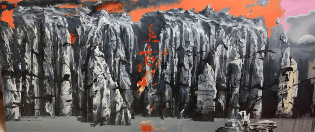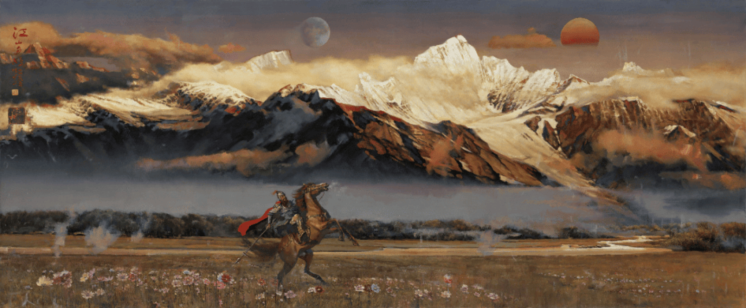 北京人民大会堂收藏并陈列的第一幅油画作品《三峡晨曲》,则标志着他将自然景观与时代精神相融合的成熟。这幅作品打破了传统风景油画的局限,以恢弘构图展现三峡的清晨气象,云雾缭绕间暗含着对水利工程建设的时代注解,成为人民大会堂悬挂的第一幅油画珍品。而在2024年香港文博会引发热烈反响的《江山多娇(龙城飞将偏将军李广)》中,他更是将哲学思考与历史叙事熔于一炉,通过堂皇大气的现代构成形式,演绎出跨越古今的家国情怀。