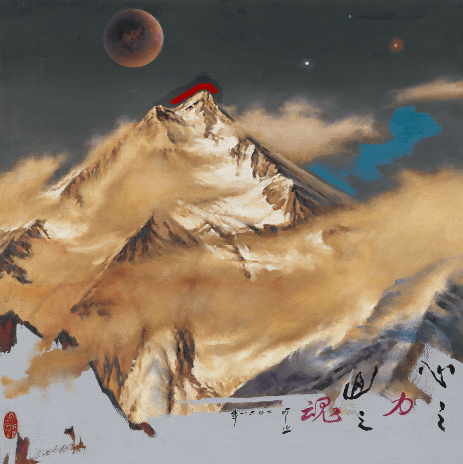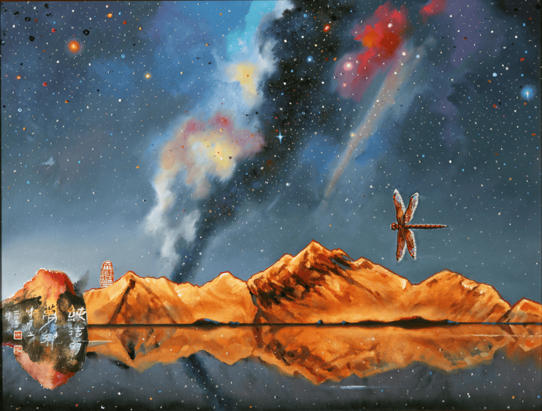 这种突破在"心宇宙"系列的《纯洁的梦乡》中同样清晰可见。这幅80x60cm的作品以水平构图构建出对称美学,湖面倒映着群山星空,一只蜻蜓飞过形成灵动的视觉焦点,左侧书法题跋的倒影与画面主体完美呼应。冷色调的基底中穿插暖系星云,既展现了梦境的虚幻,又保持了情感表达的平衡,将"以小见大、宇宙无垠"的哲理藏于方寸画布。正如艺评家所言:"陈可之让油画说中国话,让传统焕现代光。"