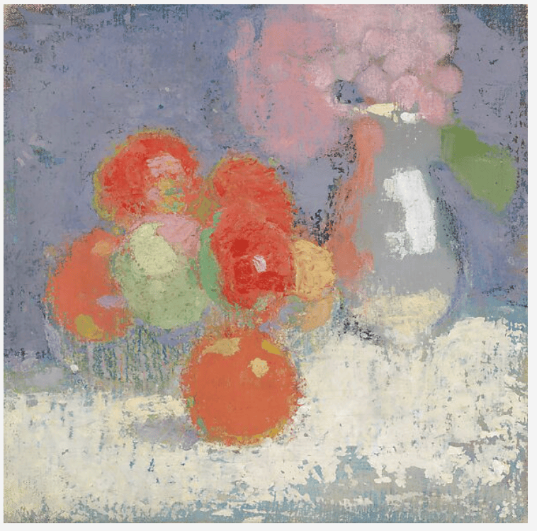 谢尔夫贝克的静物画的创作虽不及人物画深入,却成为她艺术风格演变的缩影。早期作品受法国风格影响,笔触优美、色彩柔和,贴合主流审美;到了1930年代,她开始使用干燥的笔触与颜料,以清晰黑线勾勒物体轮廓,甚至刮擦画布,让裸露的纹理成为画面的一部分;1915年《红苹果》以强烈的色彩节奏感和充满活力的画面质感,打破了她惯常的色彩体系;1944年二战最残酷时期创作的《腐烂的苹果》,更是将抽象推向极致,无体积感的黑色苹果与影子相融,以象征意义传递出时代的沉重与生命的脆弱。