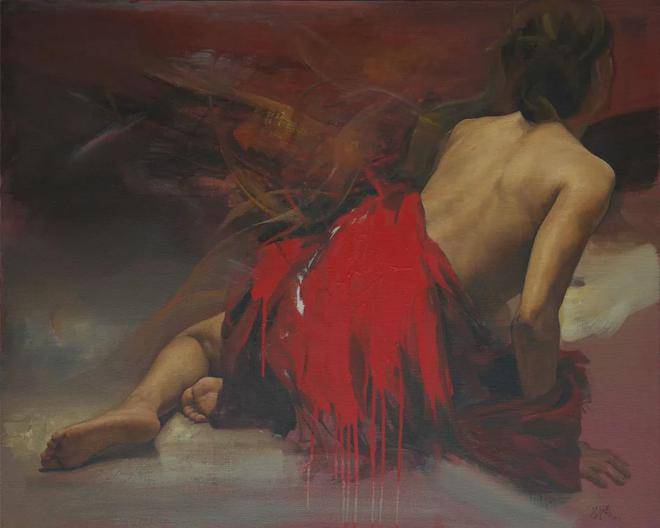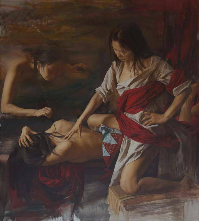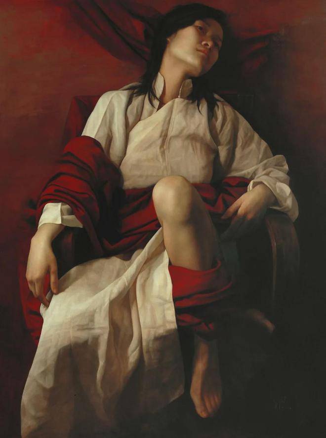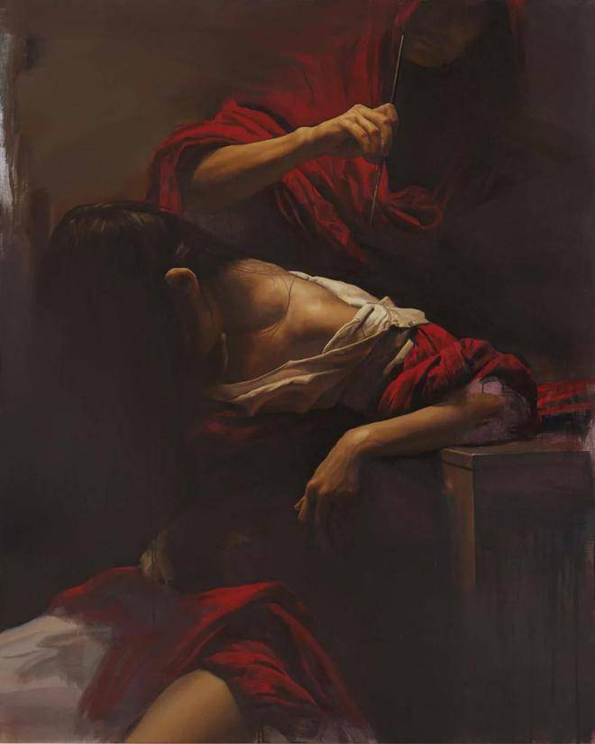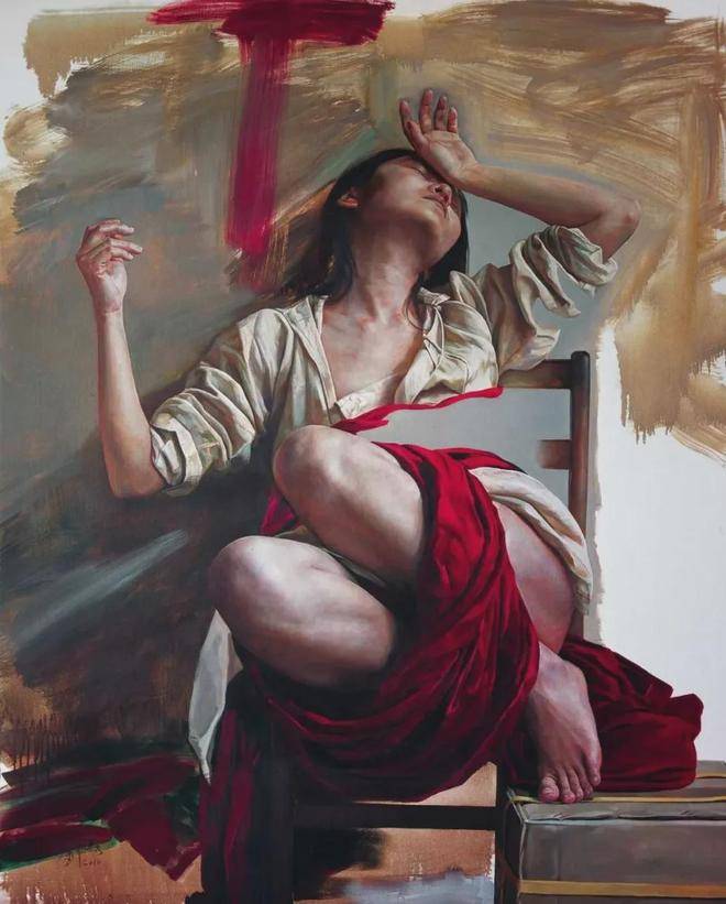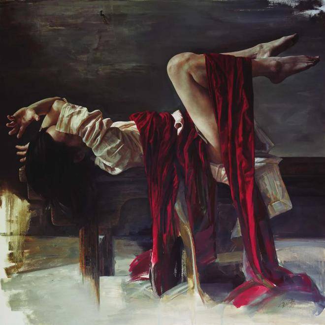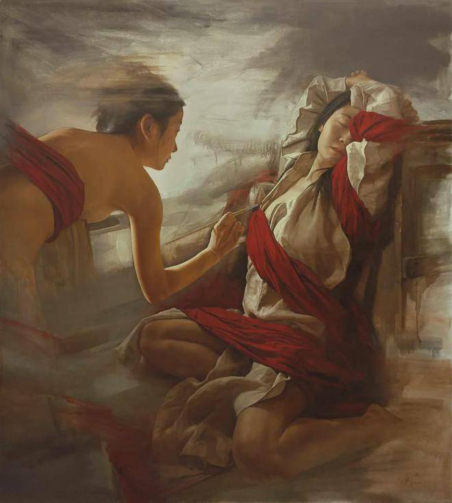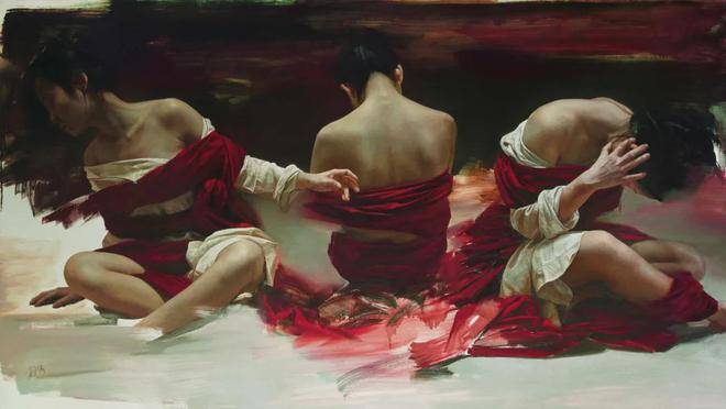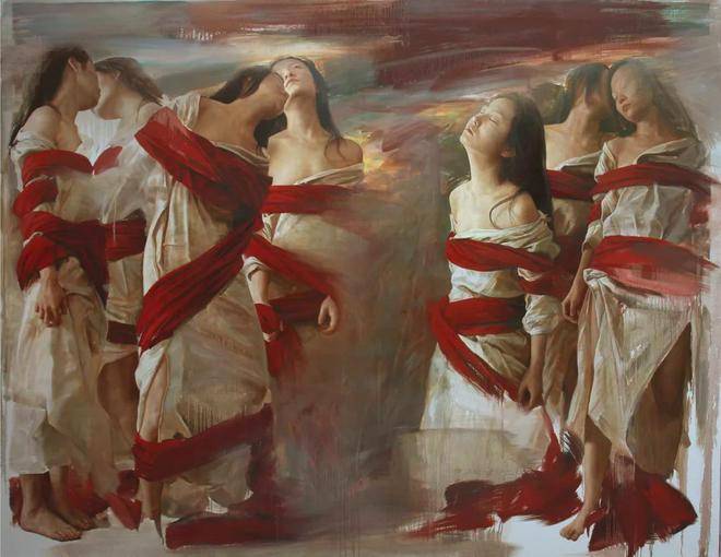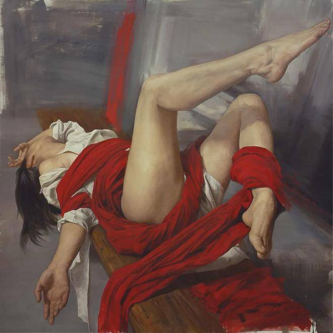 刘元寿的画布上,红布与女性,这两个看似平凡的元素,却在他的笔下被赋予了全新的生命与意义。红布,这一色彩鲜明、寓意丰富的媒介,不仅象征着热情、激情与生命力,也暗示着鲜血、牺牲与禁锢。它在刘元寿的作品中,常常作为背景或道具出现,与女性的形象交织在一起,形成了一种强烈的视觉与情感冲击力。红布的鲜艳与女性的肌肤形成了鲜明对比,既突出了女性的柔美与脆弱,又暗含了她们内心深处那份不为人知的坚韧与力量。