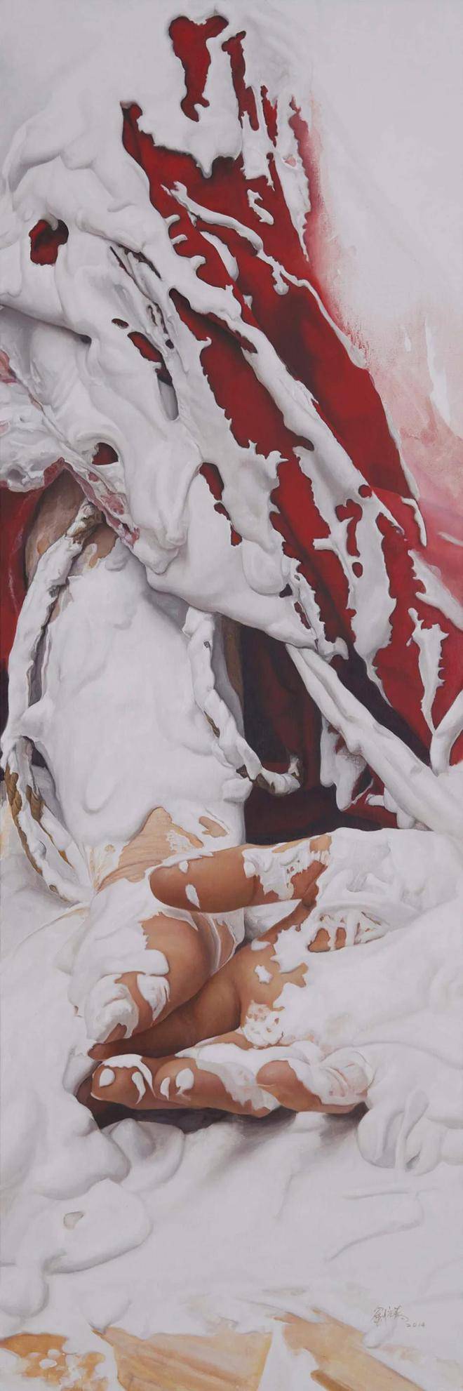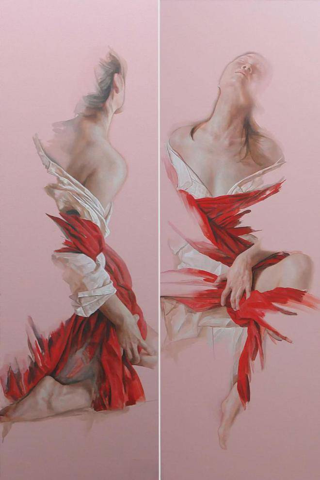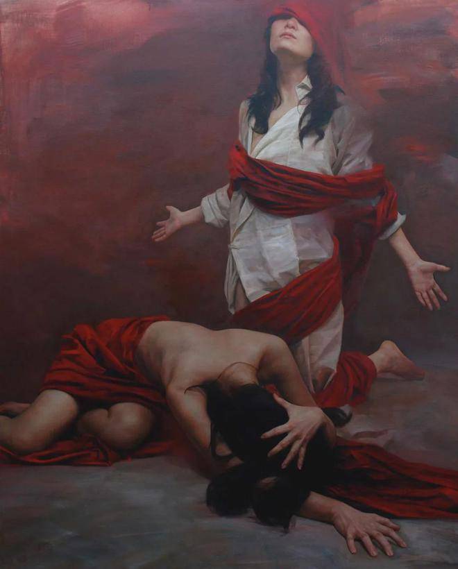 值得注意的是,刘元寿的作品并非一味地追求视觉上的震撼或情感的宣泄,而是更加注重于表达一种深层次的情感矛盾与心理冲突。红布与女性形象的交织,不仅象征着物质与精神、束缚与自由之间的张力,也反映了现代社会中个体在面对压力、困境时的心理状态。这些作品,就像是一面镜子,映照出人类内心深处的脆弱与坚强,让人在欣赏之余,不禁陷入对自我、对社会的深刻反思。