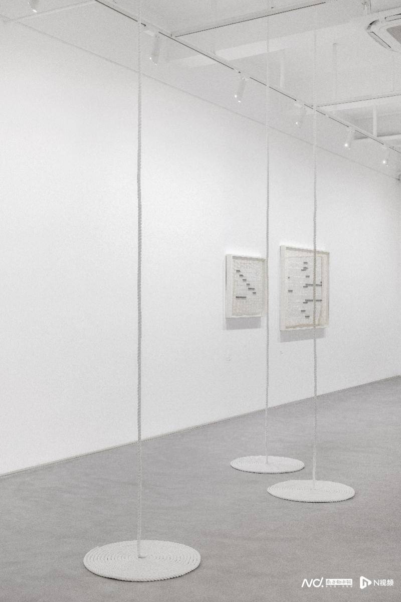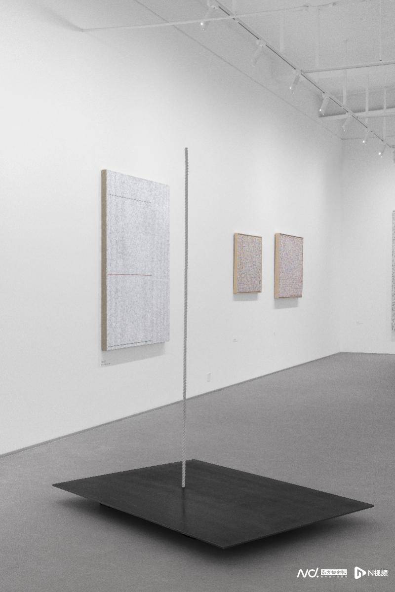 展览中唯一的装置作品《一从空来》(2009)使用绳索作为材料也作为主体意象,其线性语言介入并连通了双层展厅,构成了展览中一条重要的物理线索。二层展厅中,庄普逐渐在方格体系中融入更多色彩、图案,甚或具象元素。《因观》(1999)在印格的秩序中引入线性走向与色彩变化,营造画面内在的节奏与律动。受到德国早期浪漫主义风景画家卡斯帕·大卫·弗里德里希的启发,《弗里德里希的一棵树》(2016)则展现了庄普如何将叙事融入抽象结构——他将充满诗意的“树”植入严谨的形式之中,使自然意象在理性秩序中浮现,与其艺术实践中内含的叙事性不谋而合。