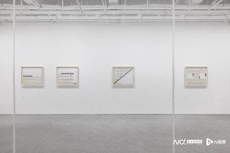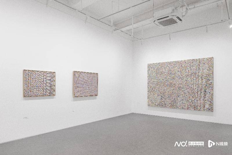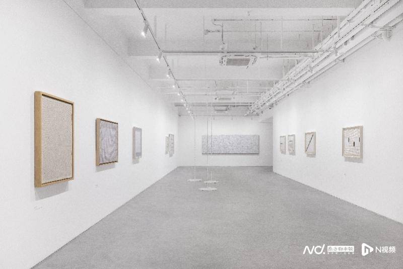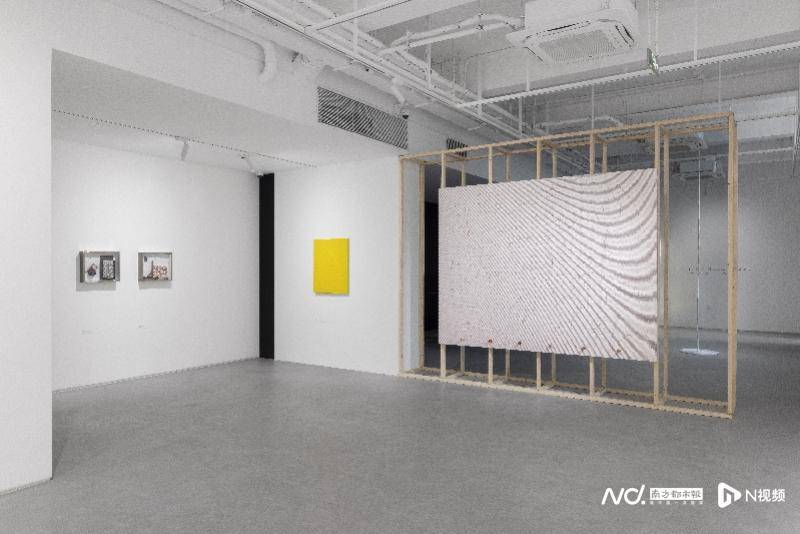 展览将在两层展厅中呈现30余件绘画与装置作品。一楼聚焦于庄普从极简形式出发,持续探索物质性与空间关系的创作。例如《蛮荒原质》(1991)采用集合艺术(assemblage)手法,在画框围合的空间中纳入拾得物(found object)与微型绘画,构筑抽象画面与现实物件之间的能量场。展厅中年代最早的《遨游四方——黄》(1983)是庄普早期的重点作品,该系列援引庄子“遨游四方”的哲学思想,表达在秩序中游走、于限制中展开的自由精神。作品通过切割、折叠画布并将其封存于明黄色颜料中,借助重复与排列构建空间秩序,突出材料与结构的生成过程,可视为其后“印格”绘画的重要前奏。《红线》(2022)则延续了庄普自1990年代开始的“缝线”系列创作,在一厘米方格矩阵中,红线沿对角线无限延伸、往复,线头则随机散落缠绕。