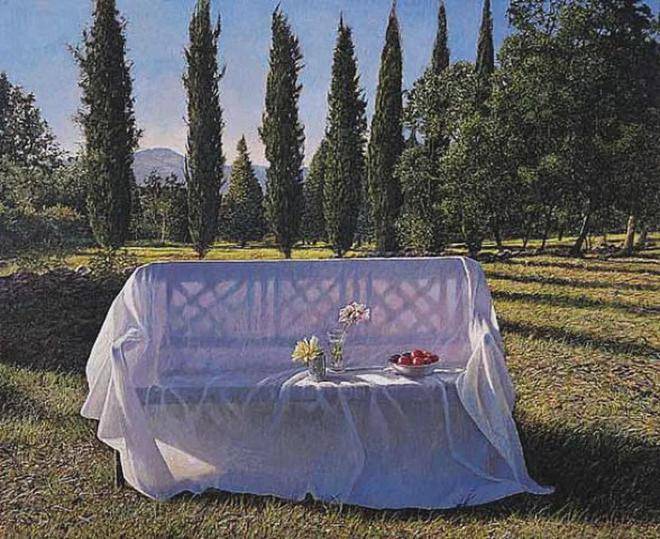 然而,这项工作的核心也存在着一个悖论。他们表现出明显的简单和直接,这是漫长的创作过程的结果。阳光在弗雷泽的场景中的动态移动是用蛋彩画渲染的——蛋彩画可能是所有艺术媒体中最复杂、最无情的。