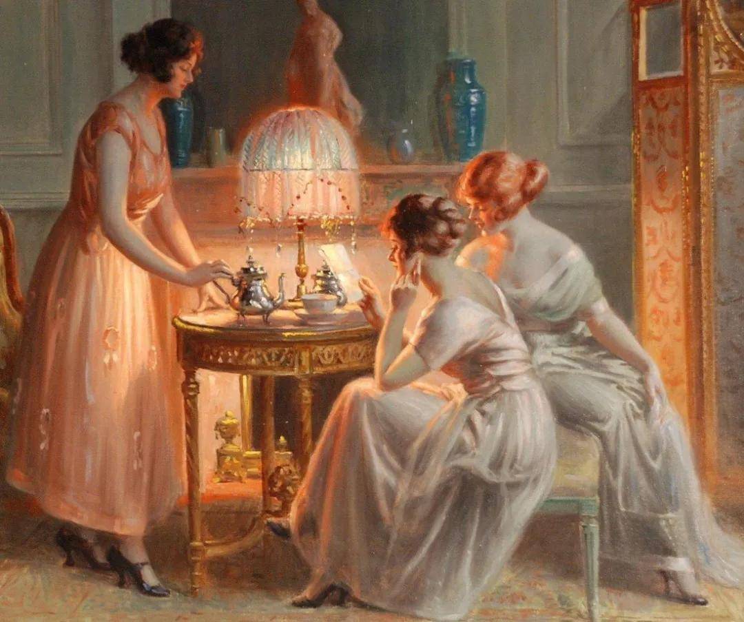 为了营造出那种独特的氛围,Enjolras在画面的构图和景物的选择上也独具匠心。他提到:“在我的画里,无论是光泽面料、火、壁炉或台灯等,所有景物都以烘托营造伟大的爱的氛围为中心。”在他的作品中,这些看似普通的景物都成为了表达情感和营造氛围的重要元素。光泽面料在光线的照耀下闪烁着迷人的光芒,象征着女性的柔美和高贵;火的温暖和摇曳,为画面增添了一份生动和活力;壁炉则营造出一种温馨、舒适的家庭氛围,让人感受到家的温暖和安宁;而台灯的柔和光线,则如同女性的温柔目光,照亮了她们前行的道路。这些景物相互交织、相互映衬,共同构成了一个充满爱与温情的世界。