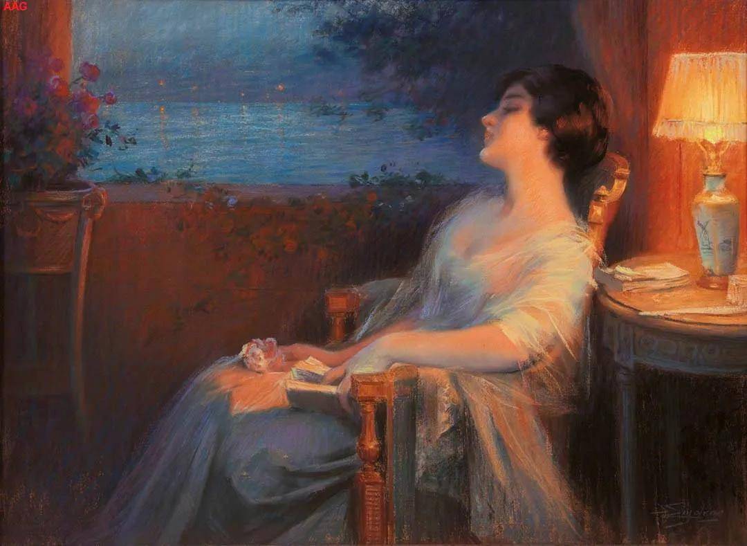 Enjolras笔下的年轻女性,常常沉浸在日常的平凡活动之中,阅读、缝纫,这些看似琐碎的举动,在他的画笔下却被赋予了非凡的魅力。他巧妙地运用灯光,将柔和而温暖的光线洒在女性身上,营造出一种如梦如幻的氛围。光线不仅照亮了她们的面容和身姿,更凸显了她们内心的宁静与专注。在那微弱而温馨的光影中,年轻女性们仿佛与周围的世界隔绝开来,沉浸在自己的小天地里,享受着阅读带来的知识滋养,或是专注于手中的针线活,一针一线编织着生活的美好。
