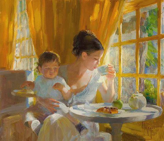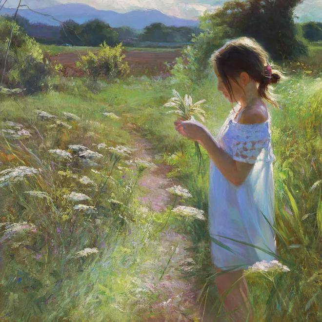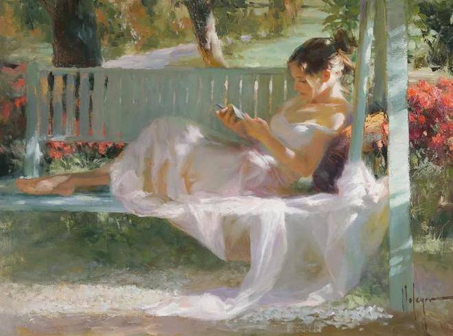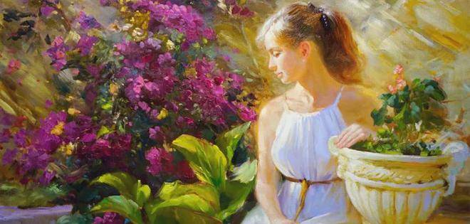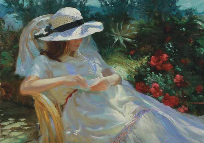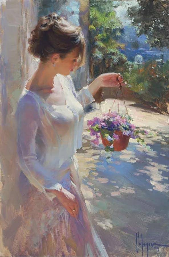 沃利戈夫善于发现美、展现美,他的画笔就像是一双神奇的眼睛,能够捕捉到女性身上最动人的瞬间。他通常将人物和风景并存于画面之中,夏日的花海、宁静的花园、温暖的阳光,与娇媚的女子相互映衬,营造出一种岁月静好的氛围。在他的作品中,阳光、花园、风情万种的女性和天使般的孩童,都是他想要表达的主题。