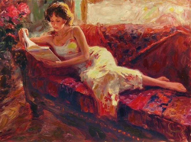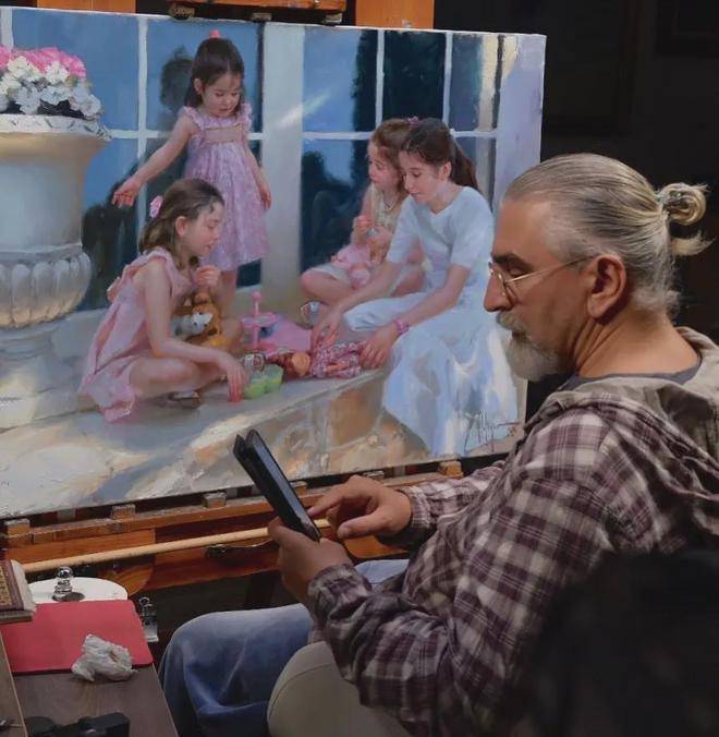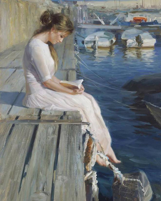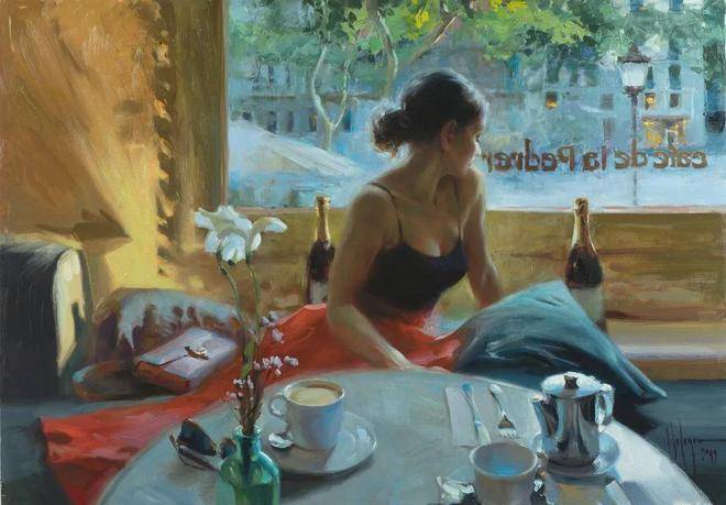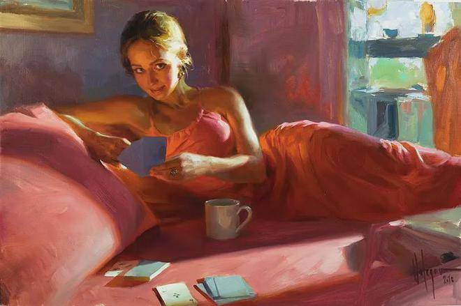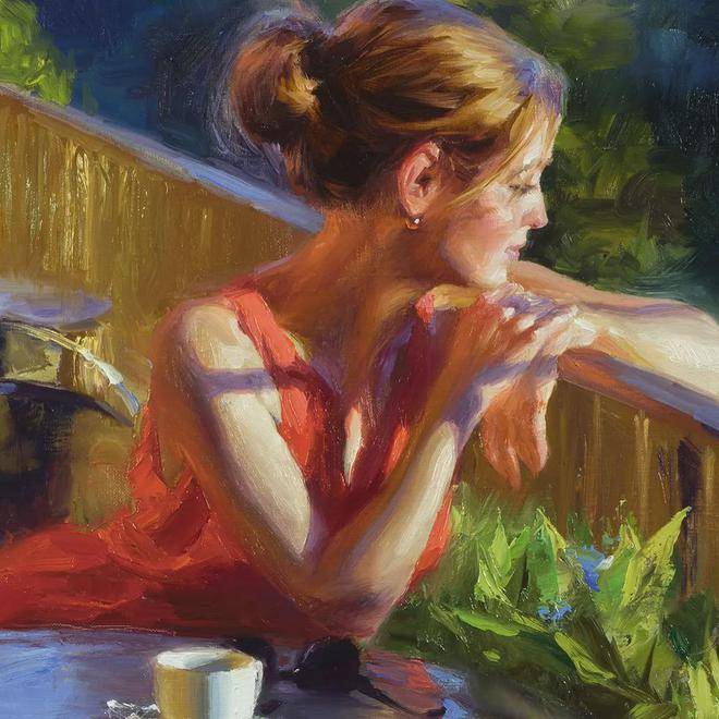 他对光影和色彩的把控堪称一绝。在他的画笔下,光影的变化被诠释得入木三分,无论是人物脸上柔和的光晕,还是背景中明暗的对比,都处理得恰到好处。色彩在他的作品中也被运用得十分熟练,鲜艳而不失和谐,丰富而不显杂乱。他巧妙地运用色彩的对比和搭配,营造出温暖、慵懒、寂静恬淡的氛围,让观者仿佛身临其境。