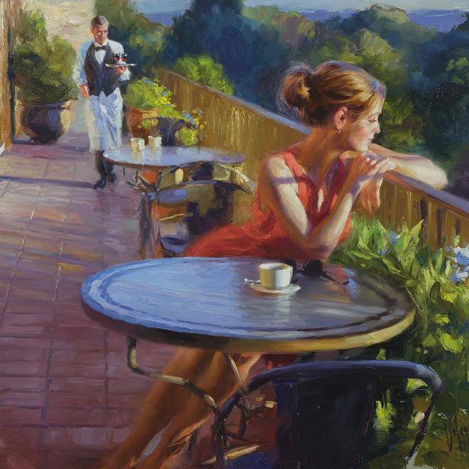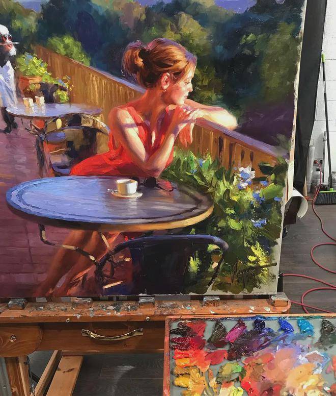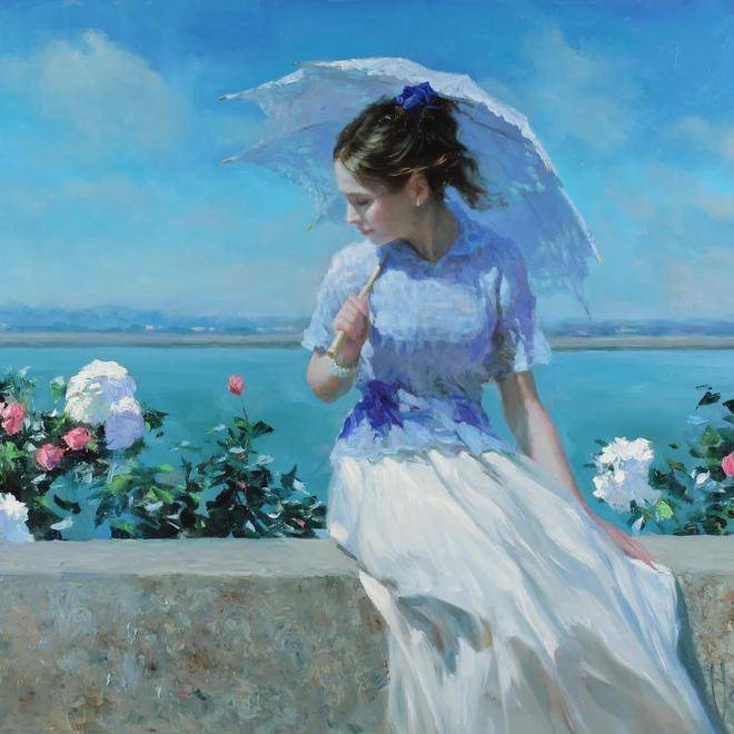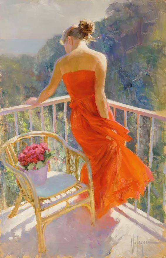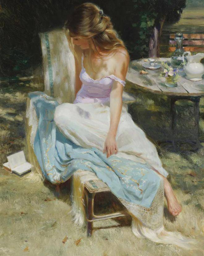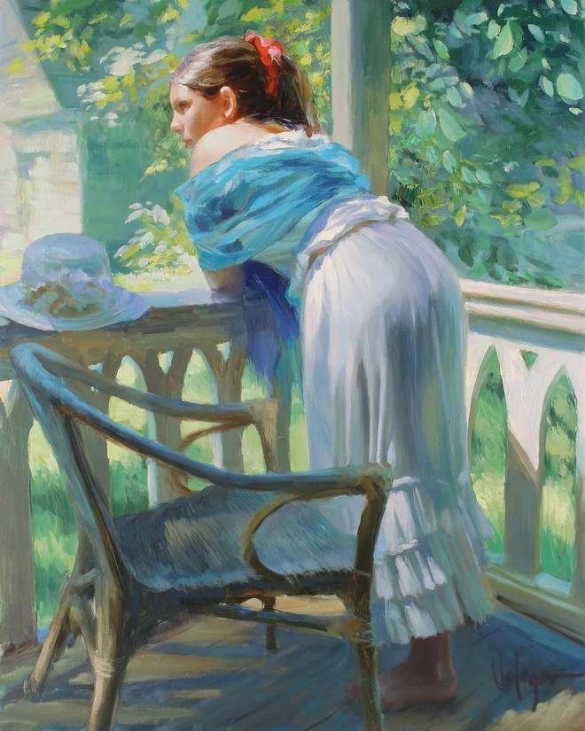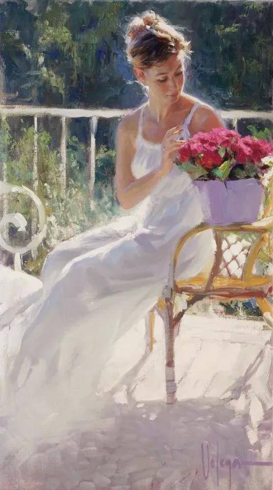 沃利戈夫的绘画习惯是从局部作画到整体。他先精心刻画塑造人物,从人物的五官、表情到服装装饰物,每一个细节都不放过。然后,再对环境和背景进行渲染,使人物与背景完美融合。这种绘画方式需要扎实的绘画功底和稳当的心态,而沃利戈夫无疑具备了这些品质。他运用大的笔触,将人物塑造得栩栩如生,户外阳光的展现更是为人物精致的脸庞增添了无限活力。
