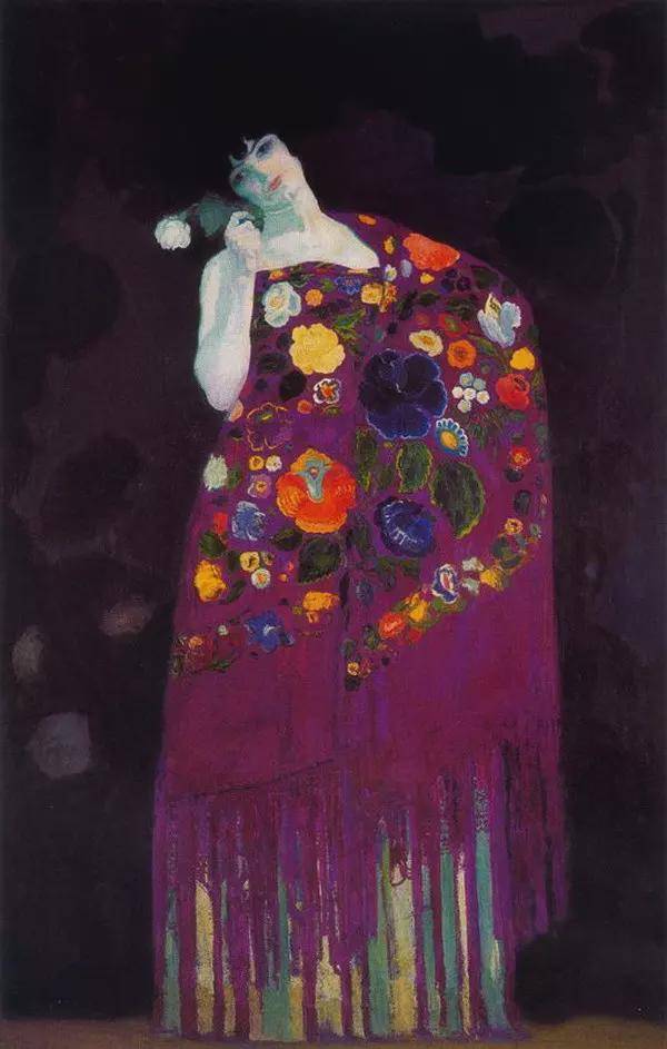 卡马拉萨作品中另一个显著特征是与维也纳分离派,尤其是克里姆特相似的装饰意味。这种装饰性并非表面的美化,而是一种结构性的视觉策略。他善于将画面转化为近乎镶嵌艺术的视觉整体,图案、纹理和色彩交织成紧密的织体。然而,在这种装饰性之下,潜藏着深刻的情感内容和象征意义。他的肖像画和场景画中,人物往往沉浸于一种内省或神秘的状态,装饰元素则强化了这种超现实氛围。