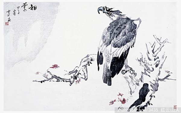 成楠采用泼墨大写意手法,大笔挥就的雄鹰,笔墨酣畅淋漓,鹰首在寒风中侧目回望,寥寥数笔,勾勒出一只风雪中英俊伟岸的苍鹰。这幅鹰画用笔刚健、用墨苍润,刚中有柔、苍中蕴秀,具有“干裂秋风、润含春雨”之妙。古人所谓“笔精墨妙”,大概也就是如此吧。