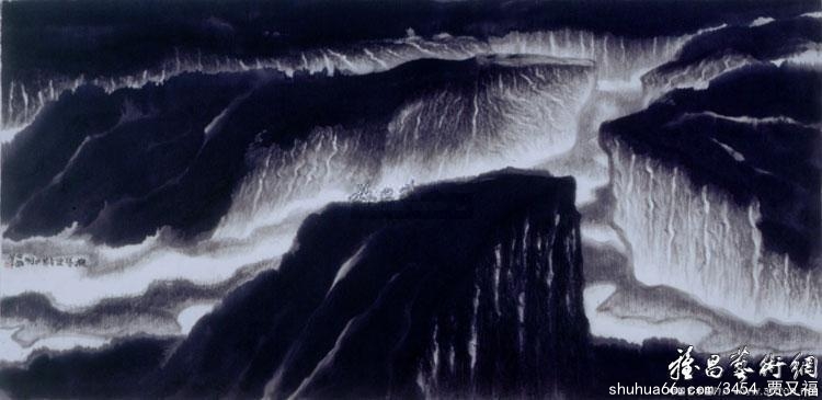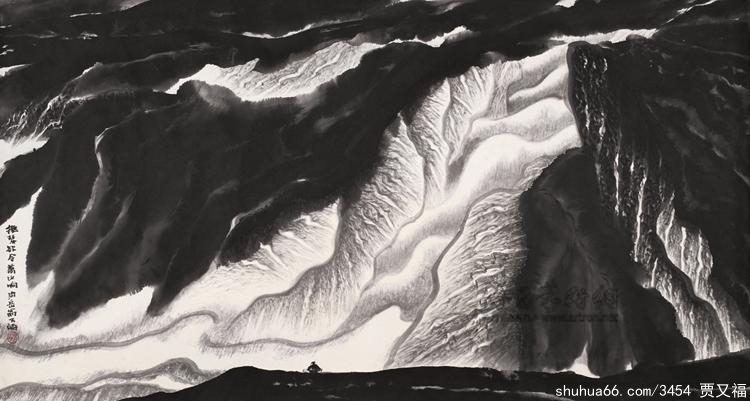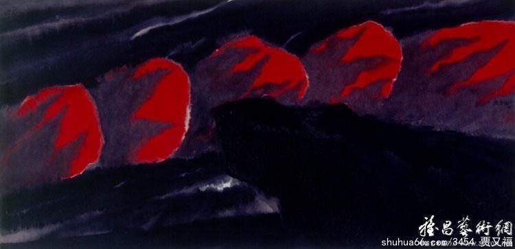 中国画家在古代就懂的“竖划三寸,当千仞之高;横墨数尺,体百里之迥。”贾又福的画有时篇幅不大,但所表现的题材巍然壮观。墨笔经过他挥洒,山脉重峦叠嶂,如烟成霭,河谷逶迤绵延,如音栖弦、真是气象万千。有时一牙小月高悬天空,有时游离于山下或涧旁……对于他来说,月亮画在地平线之上或以下。并不重要,重要的是将它画在你心中认为重要而合理的地位。在他的作品中,天和水也许会上下倒置,抽象的笔墨就象在表现一种原始的、巨大的、没有生命的历史空间。在有些表现黄昏落日景象的作品中,橘黄和大红的色彩横扫画面,就象映红地球的一片火焰;有的时候,丰富多变的墨色表现了只有在安塞尔·亚当斯摄影作品中才体味到的玄奥、寂静和神秘。对于他来说,创作是对已经逝去的一种意念的重新理解和表现。有时也需要和想法保持一定距离,不要太近,最重要的不是想法而是感情。他是用笔墨将自然情怀与人的精神气度凝为一体,他的画仿佛魂系大千世界,时醒时梦,扑朔迷离,赞颂着永恒的生命与不朽精神的神奇。