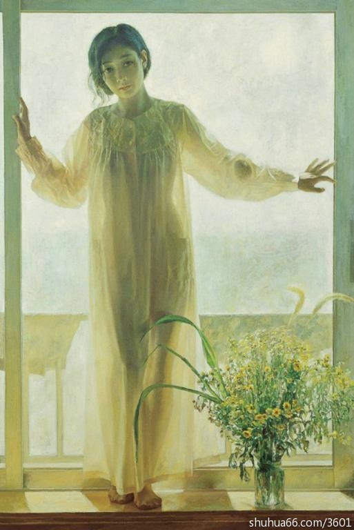 隆贵画了许多极其悦目引人入胜的油画作品,其中人物肖像引来更多人的议论,有人以西方典型论的标准高度赞扬其人物极富个性的气质和传神,这自然不错。隆贵每欲作画必长期酝酿、仔细观察、几度经营,直至人物形神兼备、栩栩如生,展示了他遵循传统的现实主义艺术方法极严、传习的写实油画技法技巧功力极深。不过我以为他的肖像画更为动人之处却在那超越个性的那种宁静、淡雅意味的共性。通观隆贵的肖像作品,无论贞童少妇,还是年轻的职业女性,在他营造的氛围中都呈现着淡泊、平实、自然的神精。那是一种人与自然的和谐,是熄灭了利欲与情私的心灵平衡。隆贵对人的描绘已超越了人生、人性的层面,渗透着赞美宇宙生命的理性。人们常把画家笔下的自然称作人格化了的自然,殊不知画家笔下的人物,也可升华为自然化了的人。在这里,世俗的情结淡化了,世事的纷争消解了,真是一片纯净。隆贵以典雅的形态、柔和的色调构成他自己的圣洁样式,述说自己内心世界的安宁梦境。他的艺术价值不是外向的过问社会变革,而是内向的净化人心。