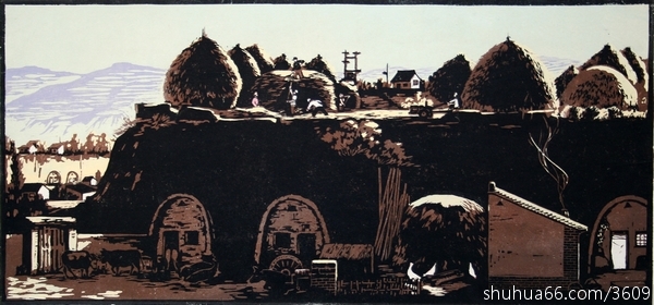 简 介: 繁忙的麦场,体现出农民一年的收成。崖下静谧的农村小院与崖背上麦场的喧闹形成对比。悠闲的牛,啄食的鸡,缓缓升起的炊烟,远山悠悠、山风荡漾,一幅人与自然合谐的画面。(已毁版)此幅《人民日报》1984年5月6日8版刊载。