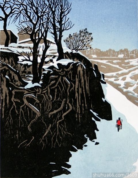 《雪霁》 31×40cm 绝版油套木刻 王维德 2011年创作 湛蓝的天,煞白的雪,清晨的山村一片寂静,担水的女子踏出咯吱咯吱的响声,留下雪晴后安宁和清净