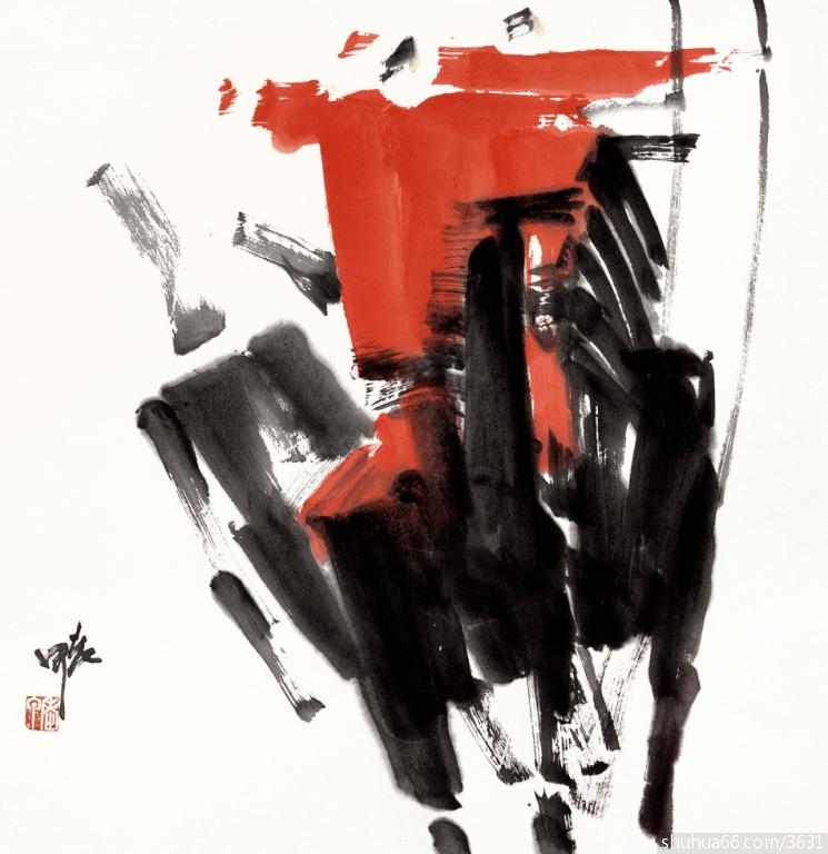 有一年,他由宁波坐船到舟山。中途起风,白浪滔天。海浪拨弄着船只,叫你倾斜,叫你颠簸,叫你险象丛生。后来他一直 想画这个场景。画浪?画漩涡?画要沉的船?可是所有这一切都有人画过。所有这一切,加起来只能让人看到:这艘船要沉了。他终于画出一幅6.7x6.7的《孤帆入 画面偏左下方,有一笔勾 出的船帆顶部,倾斜的。帆的右上方,有一个小黑点一般的小鸟。 画面左上角有一小方自然比帆更小的印章。一帆一乌一章,这个 "三点式"构成一种力的均衡。再加任何都会破坏这种均衡。这一 方白纸上的一帆一乌,随你想到这倾斜的船是在浪里行还是在雾 中航?人在这白茫茫不可测的世界里,弄不好就会翻船。船翻了, 或许小鸟知道,小乌心焦。但是它无力救你。人生一旦沉沦,别人救你就难了。世界苍苍茫茫,一个人沉沦了,一只船沉没了,就 被浪呵雾呵遮掩了。世界依然苍苍茫茫。
