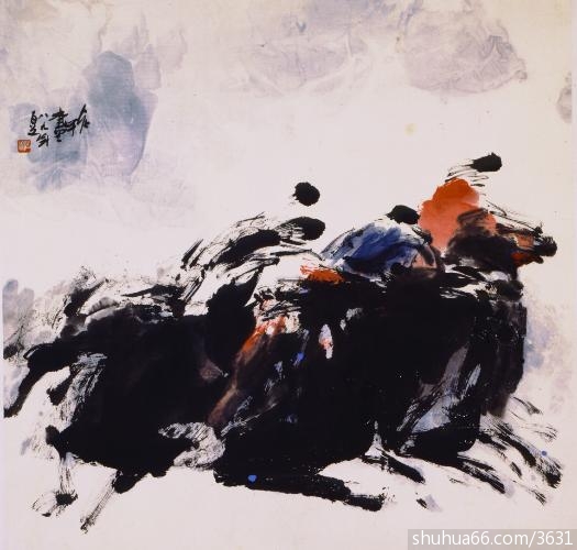 在不久前的历史阶段中,我说的是老甲以前。纸与纸,力量与力量,把它表现出来。这些都是一种谦虚的意义,但不是追求力度的一种意义。但在当代东方美术的视野里,非常谦虚的老甲登场了,他首先向宣纸宣战。而且他首先告诉大家,用最柔和的线也能表现坚硬。当老甲用最简单最柔和的线条,创作成最有力量的时候,太多的人在嘲笑他。唯有两个人没有笑,一个是八大山人,还有齐白石。但他们在旁边审视老甲的内心后,也保持了沉默。他们为什么要审视他因为老甲即便是一条线,他也非常重视。这条线有多宽,这条线有多窄,像老甲画册(《贾浩义画集》1991中国书店出版)里的《孤帆》,一个简单的帆一只简单的鸟,画过这种画的人没有。可以说,在东方绘画中画过最简单作品的人,就是老甲。一条线有多少力量注进去?一条线是否是生命,是不是美,是不是艺术的挑战。当他注入这些,面对这些的时候,自己内心的东西便不断坦露出来。我们可以看一下老甲所有的作品,他所有的线都在动,他的马他的牛比自然界里的马牛更有力量,而且使你感到迎面刮来一股风,让人听到一种声音。当代人很难接受它,因此老甲把当代无法透视的自身的牺牲展现在历史的面前,这其中包含着他无法改变的信念。老甲的每一条线都在动,再有思想的人面前他是动中更大的移动,再另一种观念面前,他会告诉你是一个多么无知的人。我研究过老甲的眼睛。他的眼睛无时无刻不在发光,那里面有力量,而且他从不往下看。这种光,这种力量,完全是他内心的透射。他的艺术里面最重要的一点,是把自己的心境摆在至高的位置,而且他能接受所有新的观察。这是他的眼睛。心高意宽的老甲重视东方,所以他能正视西方,并且在西方面前站得很直。我和老甲不久前去了趟欧洲。在他后面我注意到老甲在引导世界艺术史的大师名作面前,脚步是非常沉的。而且在那里停留很久。他在注视着动的线,鲜艳的色彩老甲没有看见。但是也有问题,这些大师都不属于当代,他们都是后来才成为大师。他们都是贫穷的,是善良谦虚的人。老甲与他们有着共同点,那就是他们爱生命爱人类;他们在神圣的大自然面前非常惧怕,惧怕中透视出他们的谦虚;他们因为追求艺术,而与名利无关。老甲从来都是在这种大师面前悄然停留脚步,我看得很清楚。