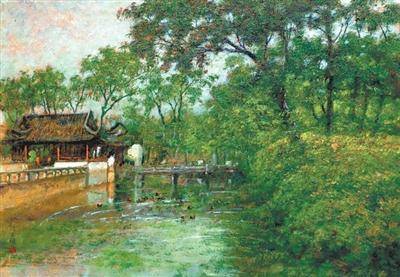 莫奈所绘的睡莲与颜文樑笔下的拙政园均以园林水景为核心主题,追求自然意境与诗意表达。前者采用裁剪构图的方式,满幅水面省略岸景,以抽象笔触捕捉光影的瞬息变化。后者则运用疏密自然的全景布局手法,生动地再现了江南园林的自然风光与天然野趣。两者一特写探微,一全景寄情,皆臻自然诗境。