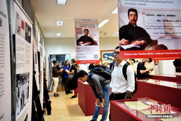 当地时间10月17日晚,巴西青年参观“鲁迅的文艺道路——不隔膜,相关心”展览。中新社记者 林春茵 摄