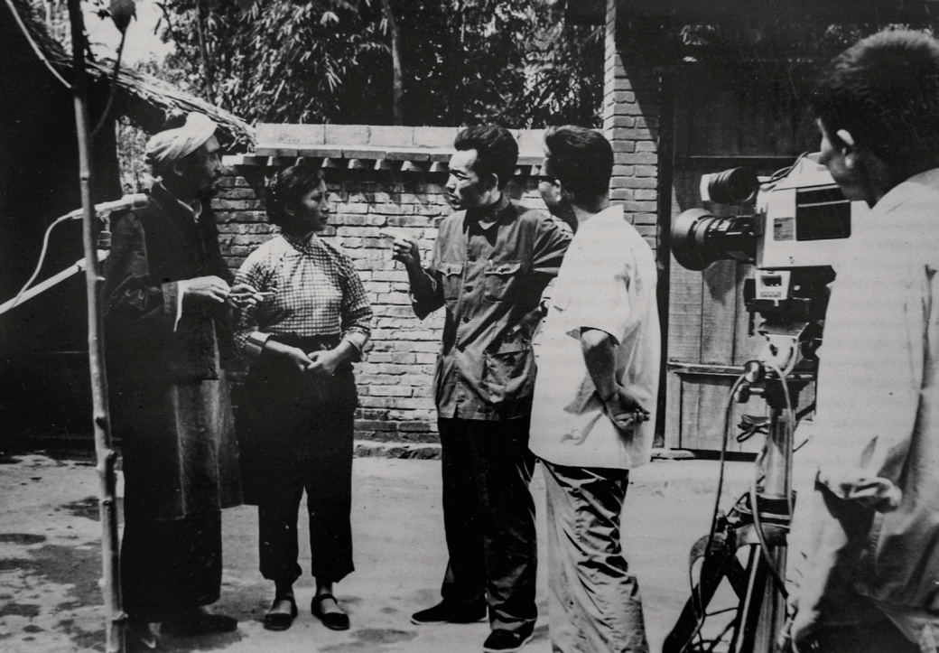 周克芹(左三)与《许茂和他的女儿们》剧组人员交谈