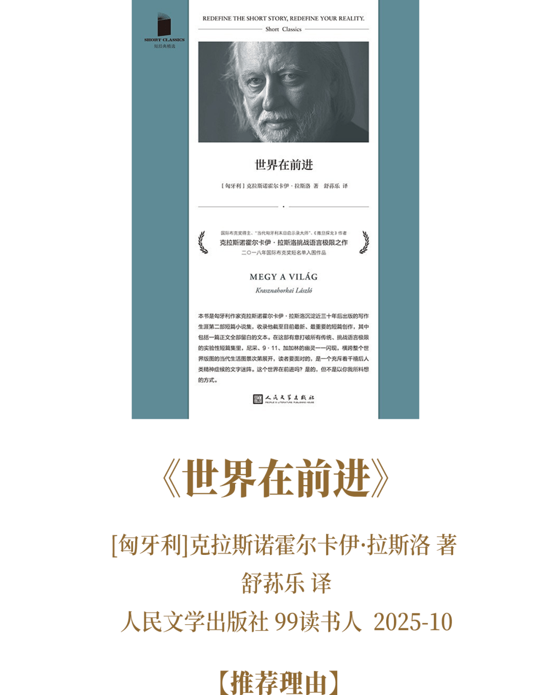 本书收录了2025年诺奖得主拉斯洛的21篇短篇小说,每篇都延续着拉斯洛爱好长难句的语言风格,和富有实验性、跳跃的叙事方式。故事的主角有“911”事件后思考世界何去何从的“沉思者”,有身世不详的俄罗斯宇航员,也有进入异世界的葡萄牙童工......他们共同讲述了一种人行走在世界边缘、摇摇欲坠的生活状态,读起来颇感阴郁不安。但也正是这种不安促使我们思考:这个世界在前进吗?是的,但不是以你我预料的方式。