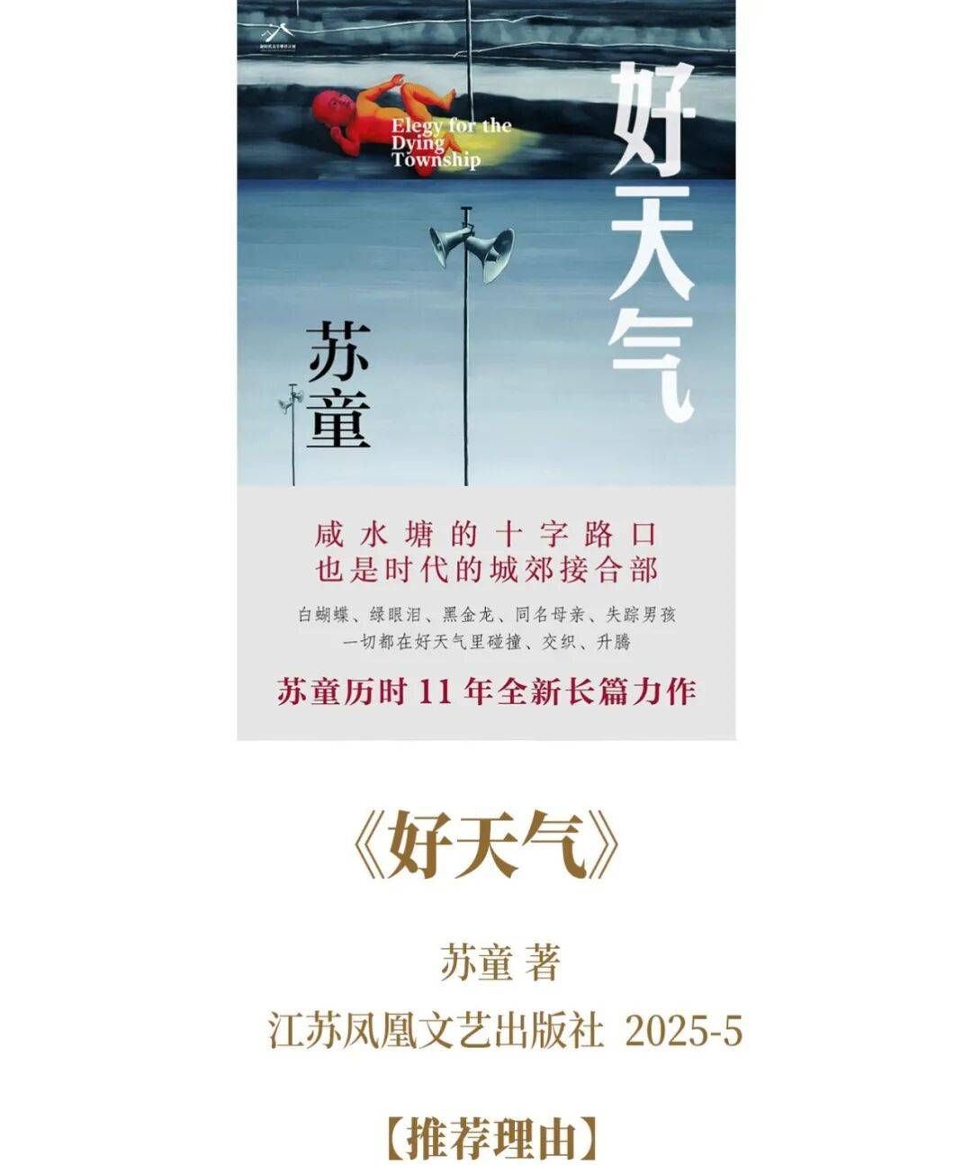 暌违许久,苏童归来。苏童的创作始终带有浓郁的“江南气息”,从《妻妾成群》的深宅悲剧到《好天气》的城郊风云。本书的故事,开始于1970年代中期。在江南城乡结合部 “咸水塘” ,塘东蒲招娣和塘西黄招娣两家因蒲家祖母棺材归属结怨,黄招娣之子继而失踪,矛盾彻底激化。一系列离奇怪诞的事件,与社会现实紧密相关,从火葬改革、破除迷信,到生产方式变迁、城乡剧变。苏童以一贯的少年视角看残酷的成年世界,鬼鹅、绿眼泪等志怪意象编织在奇谲瑰丽的荒诞情节中,又映照出真实的人性与时代。