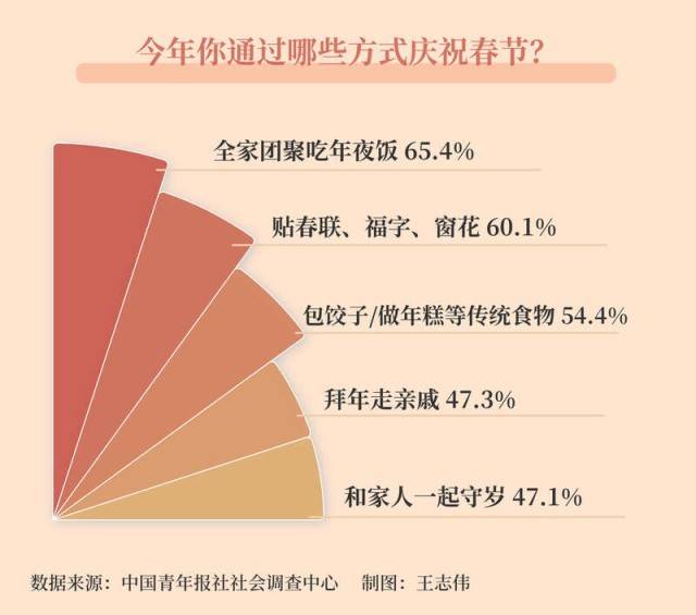 今年大家会通过哪些方式庆祝春节?调查显示,全家团聚吃年夜饭(65.4%)、贴春联、福字、窗花(60.1%)排在前两位,54.4%的受访者会包饺子/做年糕等传统食物,47.3%的受访者会拜年走亲戚,47.1%的受访者会和家人一起守岁。其他还有:收发压岁钱(42.2%),逛大集、庙会、灯展等活动(33.1%),祭祖祈福(22.5%),旅游过年(14.2%),云拜年(9.7%)。