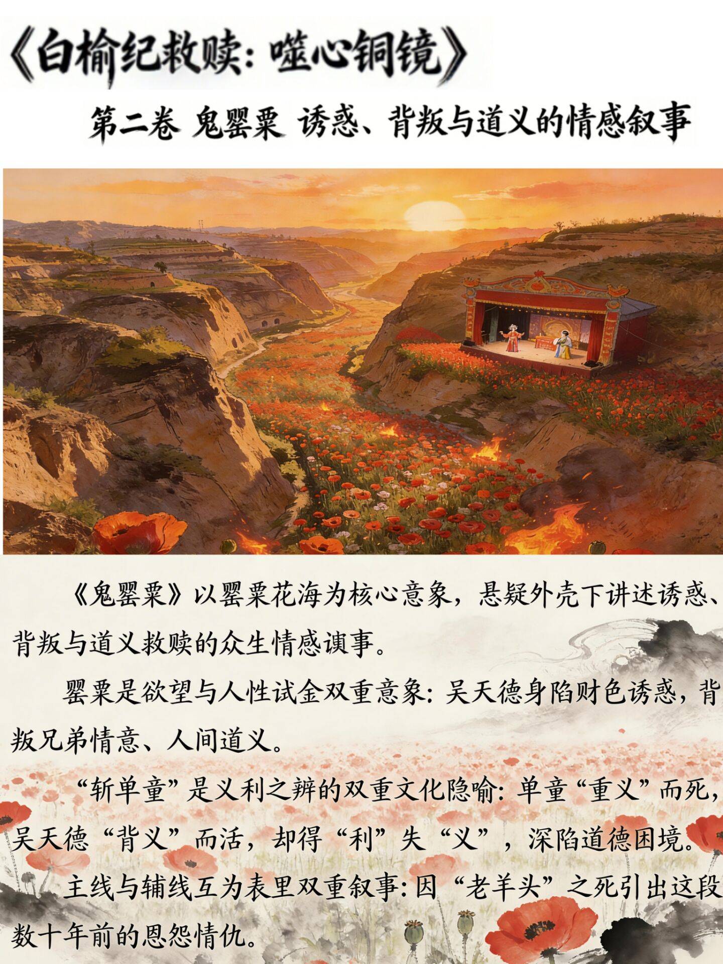 《白榆纪救赎:噬心铜镜》第二卷“鬼罂粟”,以陕北黄土高原苍茫荒凉的千沟万壑为背景,以诱惑人性、腐蚀生命的罂粟花海为意象核,在悬疑探秘的外壳下,通过复杂的人物关系与精巧的叙事设计,从象征隐喻、文化意蕴和叙事结构三个维度,构建了一个关于诱惑、背叛与道义救赎的众生情感叙事。