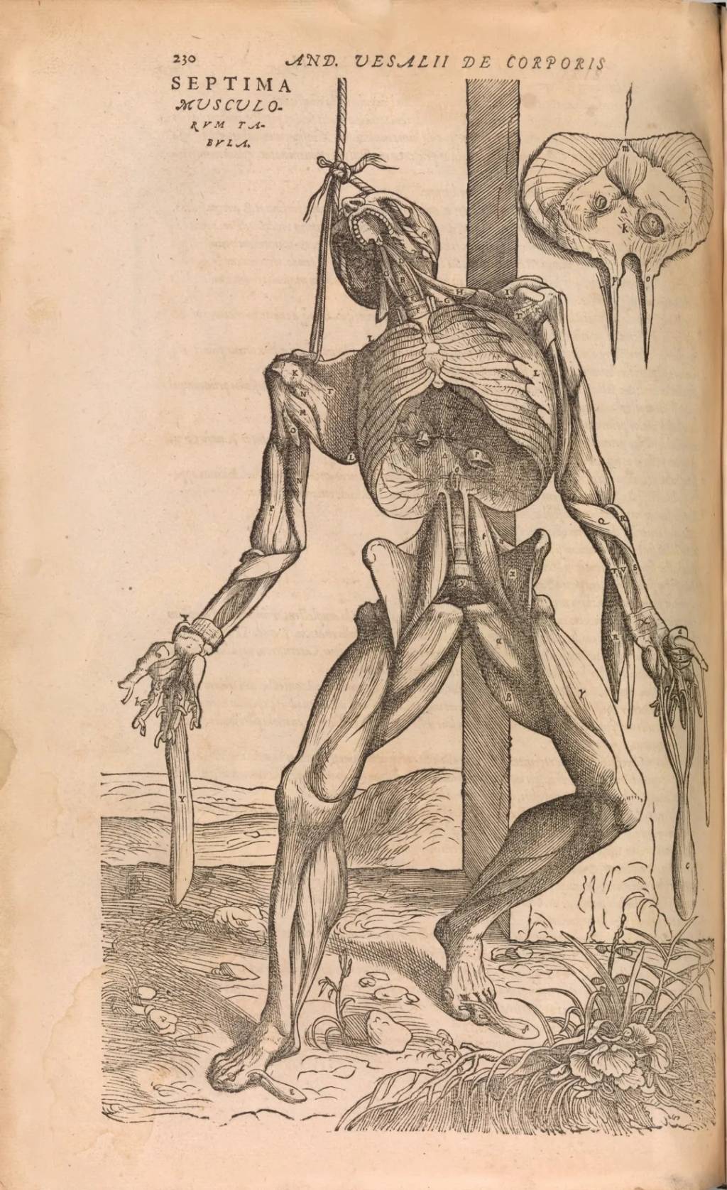 随后使解剖学获得革命性进展的,是意大利帕多瓦大学的解剖学老师维萨里,他曾在鲁汶大学进修了美术专业。众所周知,中世纪欧洲宗教明令禁止解剖尸体,这在很大程度上妨碍了医学的发展,而将非法获取的尸体尽快准确地记录下来,没有人能比一位熟练的美术生做得更好。1545年,维萨里的《论人体结构》(De Humani Corporis Fabrica)问世,彻底颠覆了人们对人体结构的认识及传统解剖艺术理念,那些精心刻画的插图也成了医学和美术史的双重经典。维萨里笔下的人体模特总是作出夸张的姿态,很容易让人联想到宗教画里的人物,且与背后的建筑和自然风景结合,形成一定的叙事效果。这些经过各种元素润饰的解剖图像在风格上接近16世纪流行的雕版画,不仅被外科医生、药房和助产士当作招贴,还受到普通市民的喜爱。