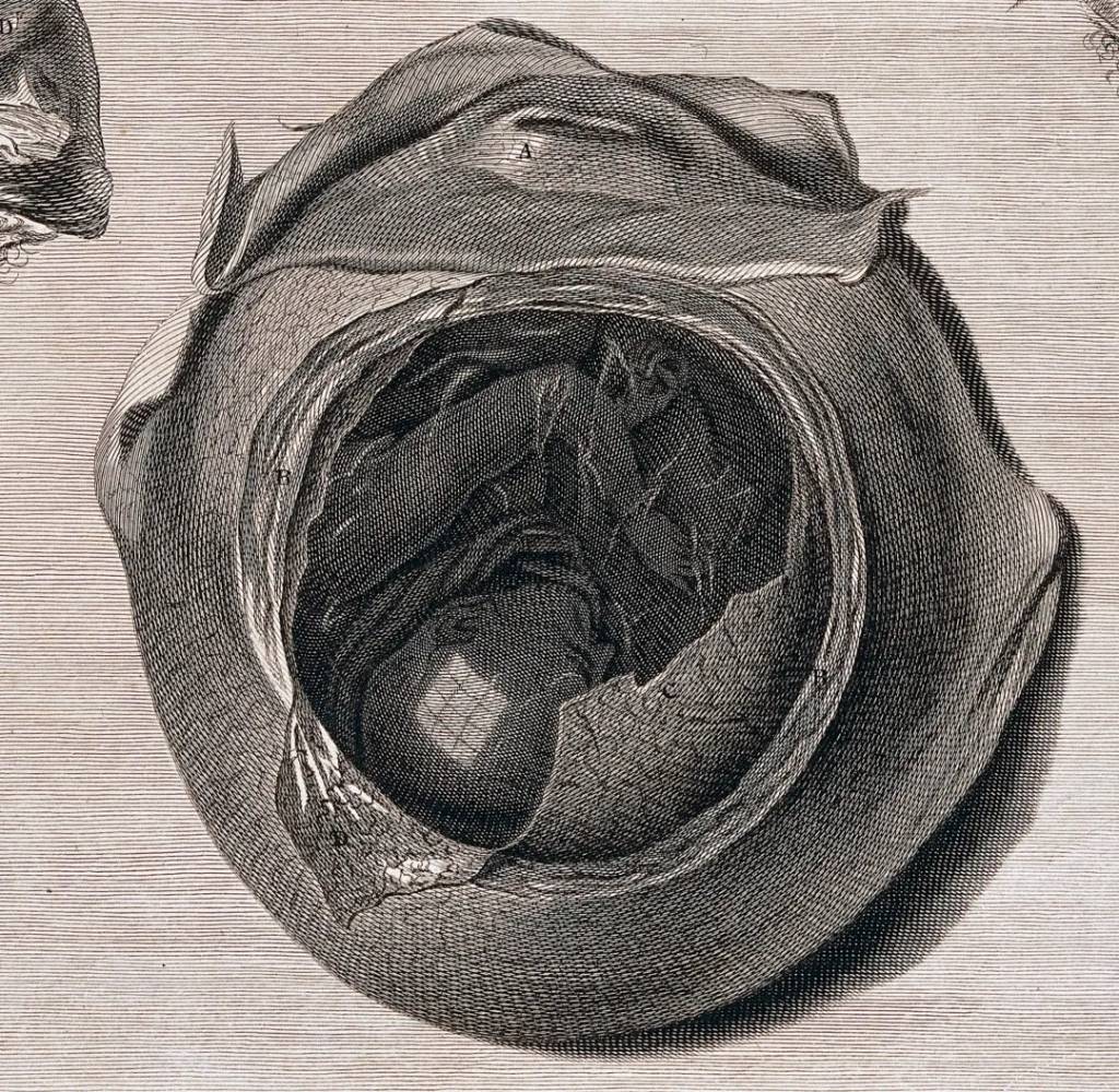 因此像约翰·贝尔这种相对务实的医者看来,解剖学插图应在审美上保持低调,功能上更注重实效。尽管他的美术功底也十分深厚,但他的作品很难被非专业人士欣赏,甚至有人认为他刻意丑化伤口、病变和感染,真实得令人毛骨悚然。无论人们喜不喜欢,以更加科学的眼光来看待人体及其病理特征已是大势所趋。在18世纪,经验主义风潮席卷了英国科学思想界,体现在解剖学领域就是“原始摄影术”(proto-photographic method)登堂入室,将“如实描绘”(warts and all)的观念推到了顶峰。写实到了什么程度呢?威廉·亨特在1774年出版的《人体妊娠子宫图谱》有许多绝佳的例子,比如《胎儿与膜》一图中,胎儿头顶有一块布满细线的光斑,如果作者不解释,谁能想到那是解剖室八扇玻璃窗的倒影?
