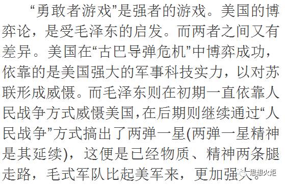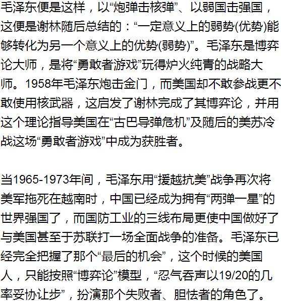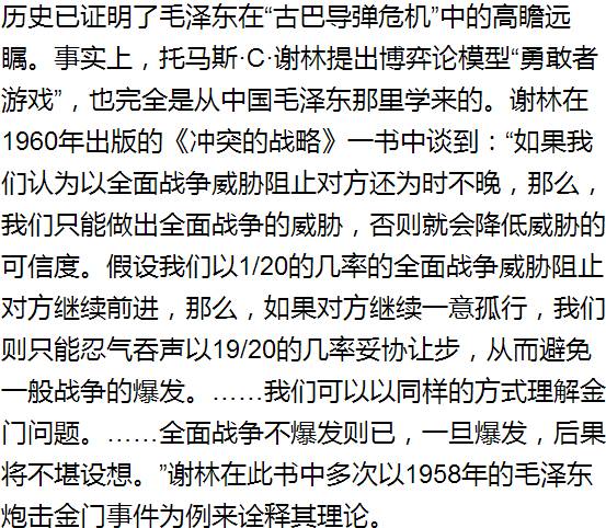 2008年6月12日,诺贝尔经济学奖获得者托马斯·C·谢林在中南大学做报告谈核战略及其博弈论,其中提到六个案例,1962年之前的案例便是朝鲜战争及1958年毛泽东炮击金门事件。谢林指出,金门炮战中,毛泽东扩大态势,但美国却不敢使用核武器。由此可见,1958年毛泽东炮击金门,是谢林博弈论“勇敢者游戏”模型提出的主要渊源和背景。在这场“勇敢者游戏”中,毛泽东是完胜者,美国总结毛泽东的经验和原则,拿来战胜了苏联。说毛泽东是美国的战略导师,当然是当之无愧的。