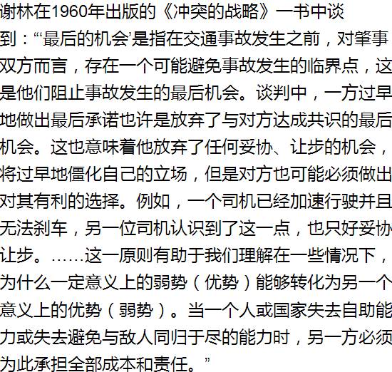 整个冷战是一场“勇敢者游戏”。美国在冷战中战胜了苏联,其采用的“边缘政策”式的威慑战略,出自兰德公司的博弈论。