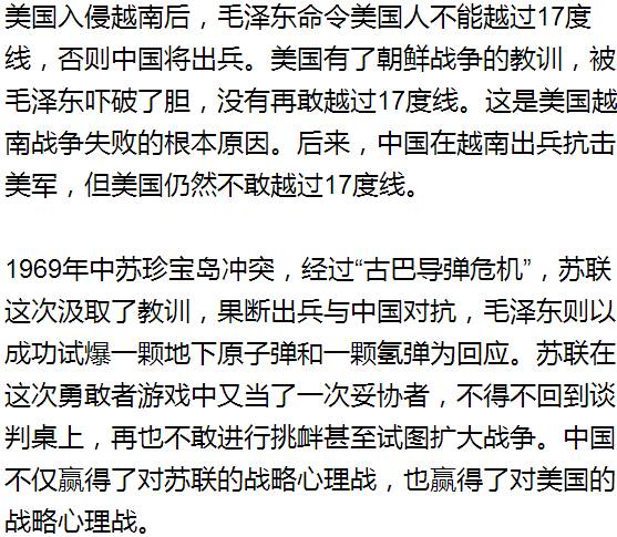 在金门事件中,美国试图以“战争”威胁中国毛泽东,而毛泽东则“一意孤行”地扩大事态,最终结果是,美国害怕与中国爆发全面战争,“只能忍气吞声地妥协让步”。为何美国惧怕与中国的“全面战争”?因为当时的美国仍处在几年前“朝鲜战争”大失败的阴影里:在这场战争中,中国军队的武器虽然极其落后(初期入朝军队的主要武器是三八大盖,而后期苏式武器则尚未使用熟练战争便结束了),并且完全没有战场制空权(后勤运输部队出现大规模伤亡,志愿军因缺乏御寒衣物大批冻死),却将美军从鸭绿江赶到三八线。