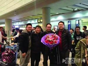 同事们到机场迎接曹红国(手拿鲜花者)回国。