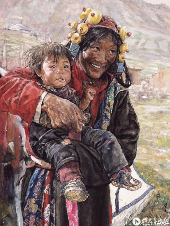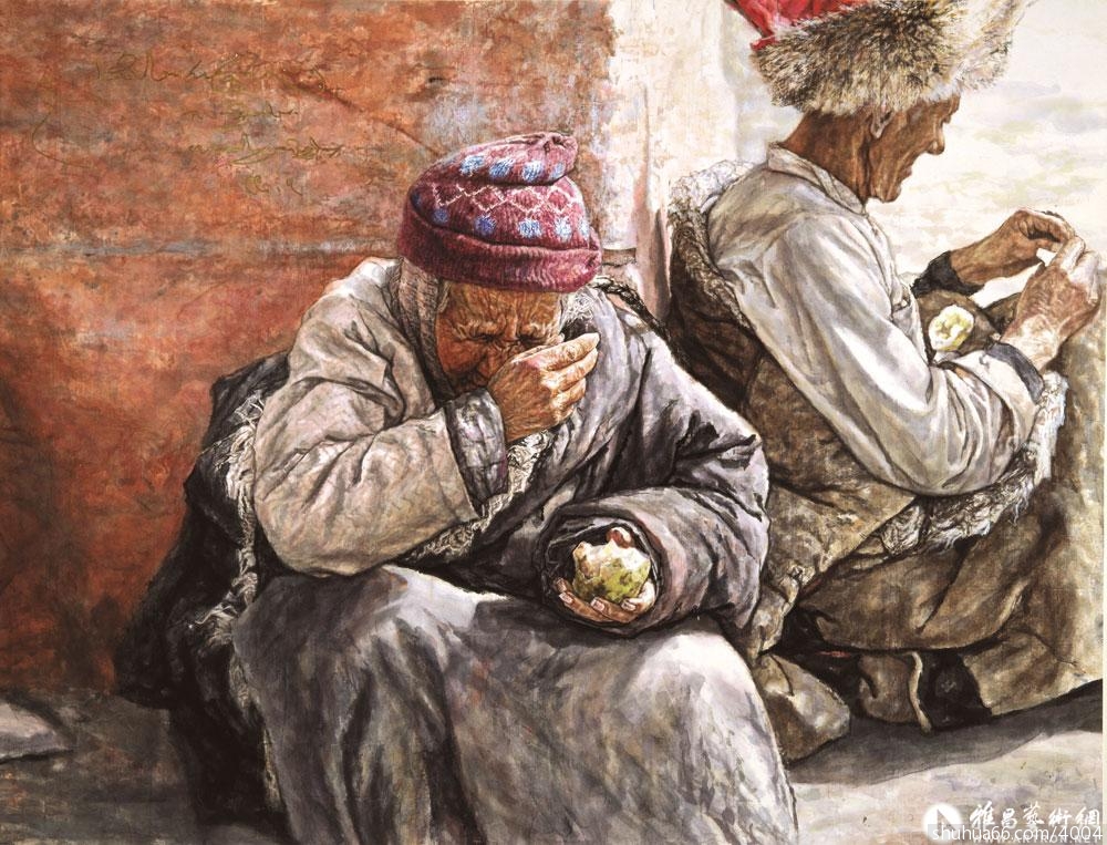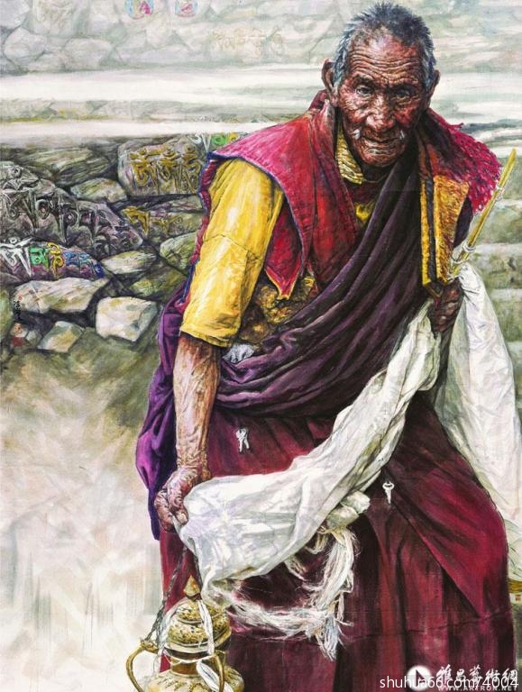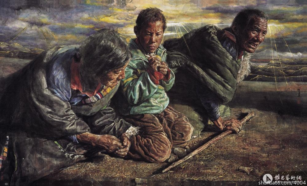 因而,她画面上的藏民不再是一种猎奇的、人类学式的再现,而是崇高生命意识执着的表达,充满着悲天悯人的慈悲情怀。