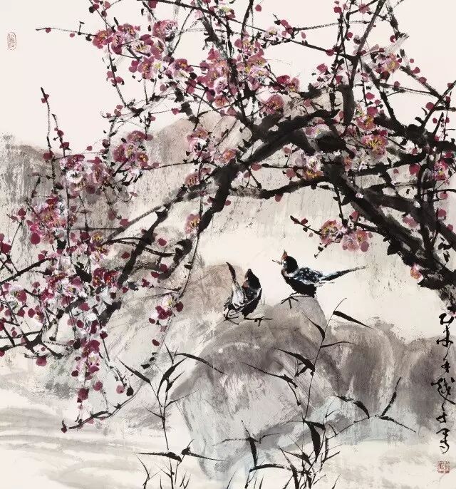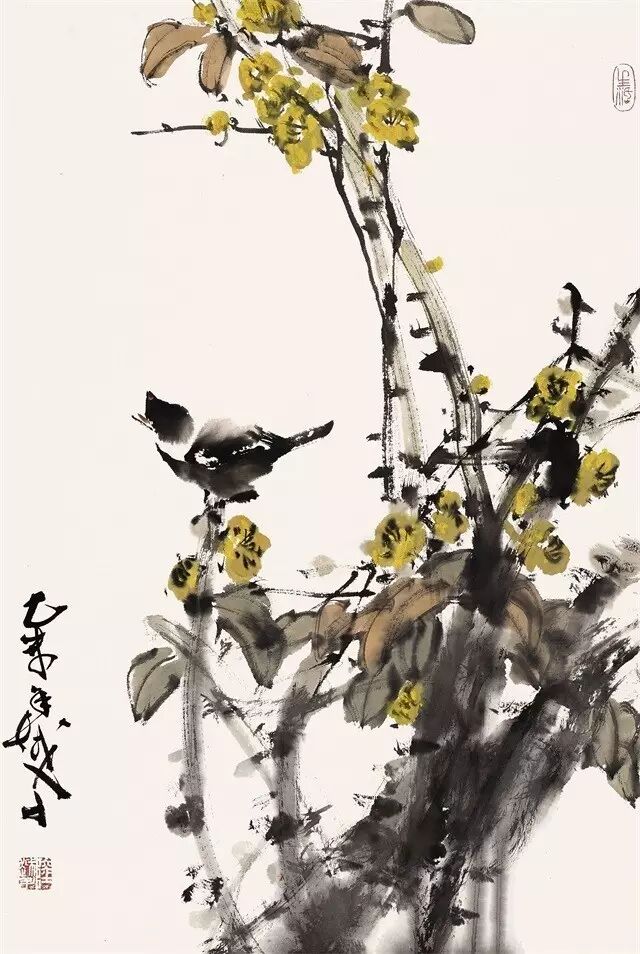 其一:眼高手高。古今画家中,有眼高手高者、眼高手低者、眼低手低者。这主要取决于画家文艺修养的高低与艺术实践的多少。只有眼高手低的人,未见眼低手高的人。眼高手低者,可以通过不断实践,使之手高;而眼低手低者,无论怎么实践,也难以手高。我的意思是说,一个艺术水平很高(手高)的画家,必须是一个文艺修养很高(眼高)的人。而越子当属于这种人。他在艺术实践的同时,十分重视文、史、哲及美学、美术史、画论等方面的研习。其结合创作实践和教学实践所撰写的《中国花鸟画技法》、《中国花鸟画构图法》、《中国花鸟画笔墨》等十余种著作,虽论法,却由法体现理,由理体现道。他在王维“意在笔先”论基础上,发展为“意在笔后”论。提出的中国花之最原始的现象最基本的用笔方法“一画之圆型”论,是对石涛“一画论”在用笔的创造性运用。还将传统人物画之“十八描”法嬗变为花鸟画之“十八描”法。正因为他在理论上有独到见解,且与他的艺术实践紧密结合,故其作有深度,有意境,有文气,有品位。