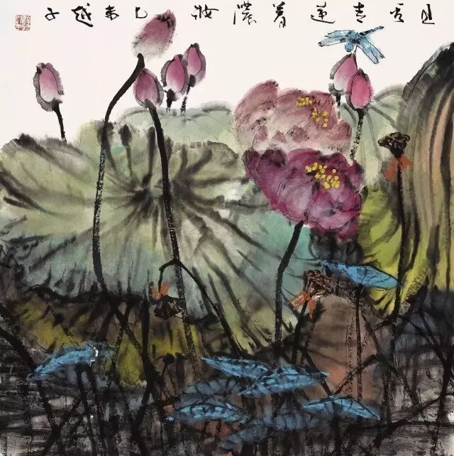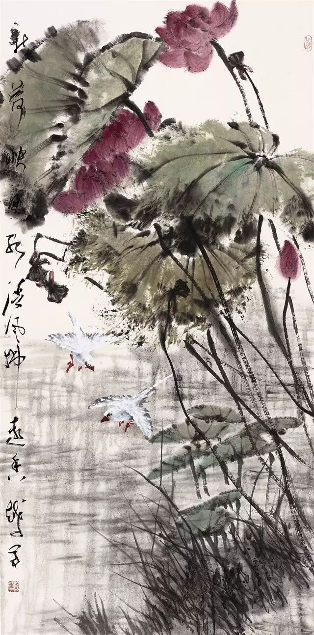 其三:妙在用水。在大写意花鸟画中,笔、墨、色之间的关系 ,赖水为媒介。笔、墨、色合作生动,妙在用水。以笔、墨、色为形,以水为气,气行形乃活矣 。用笔、用墨、用色固难,用水则更难。齐白石自称他“用水五十年,未能得其妙”。明清画家用水最好的要数徐渭、李鱓,见之于大写意花卉;近现代则有刘海粟、张大千,见之于泼墨、泼彩山水。陆君则得古人前贤用水之三昧,在其著作中,论述破墨、泼墨、冲墨、吸墨、让水法、赶墨法、排结法、晕结法、青黛杂墨水法等,无不与掌握用水之多少、方法有关。他是把水作为一种颜色来使用的,破墨、破色,得心应手,出神入化,使水墨化色化,增加墨次、色次与画面之层次,浓淡自然渗透,相互掩映,虚中有实,实中有虚,虚实相生,真幻交迭,浑沦滋润。使笔墨色有尽而妙境无穷、志趣横生。观其作,其用水之妙,非一般画家所能及也。