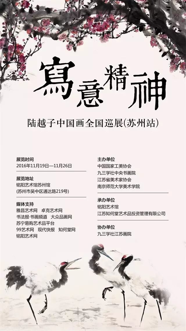 "写意精神"陆越子中国画全国巡展11月5日在铭阳艺术馆盐城馆开展。此次展出吸引了众多书画爱好者前来观展,多家业内知名媒体报道,引起了轰动。"写意精神"陆越子中国画全国巡展(苏州站)将于2016年11月19日在铭阳艺术馆苏州馆开展。