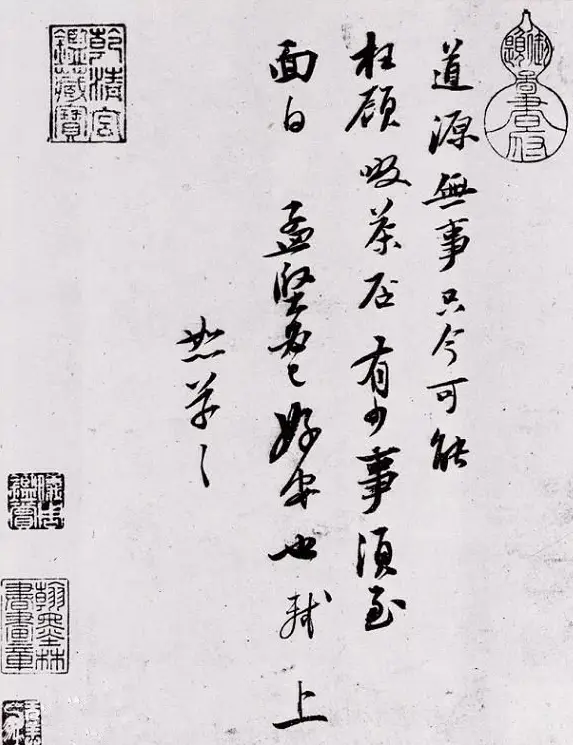 《啜茶帖》,也称《致道源帖》,是苏轼于元丰三年(1080)写给道源的一则便札,22字,纵分4行。《墨缘汇观》、《三希堂法帖》著录。其书用墨丰赡而骨力洞达,所谓“无意于嘉而嘉”于此可见一斑。